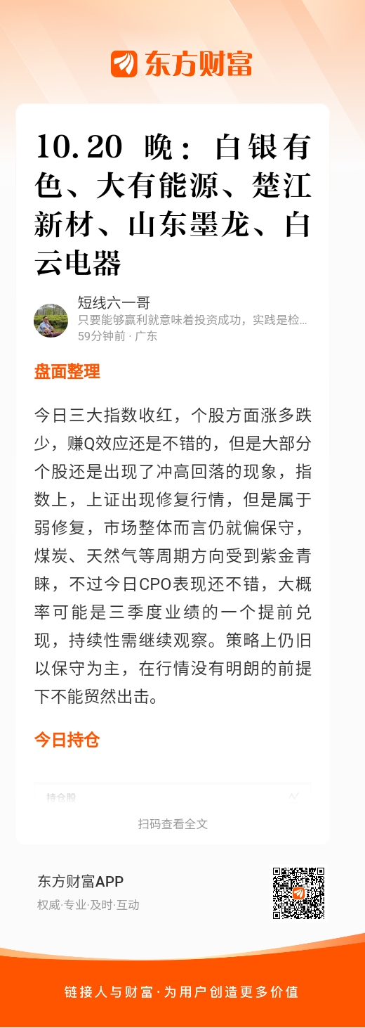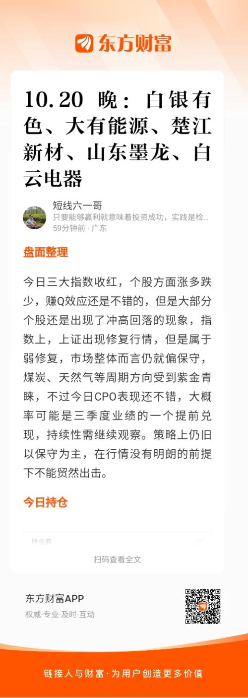 今日三大指数收红,个股方面涨多跌少,赚Q效应还是不错的,但是大部分个股还是出现了冲高回落的现象,指数上,上证出现修复行情,但是属于弱修复,市场整体而言仍就偏保守,煤炭、天然气等周期方向受到紫金青睐,不过今日CPO表现还不错,大概率可能是三季度业绩的一个提前兑现,持续性需继续观察。策略上仍旧以保守为主,在行情没有明朗的前提下不能贸然出击。