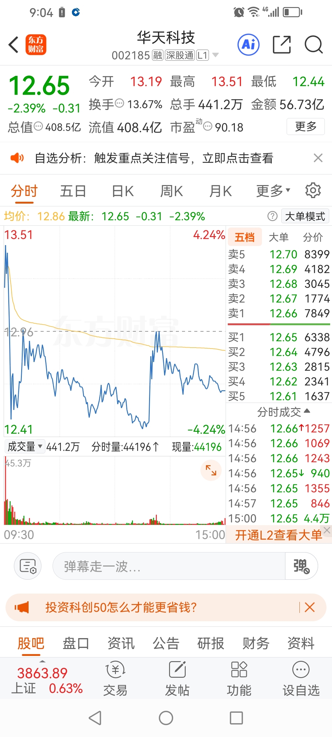 $华天科技(SZ002185)$ 今天这个走势极像主力在出货,除早盘高开外,两波从12.44低点快速拉升到周五收盘价12.96,都是慢慢回落