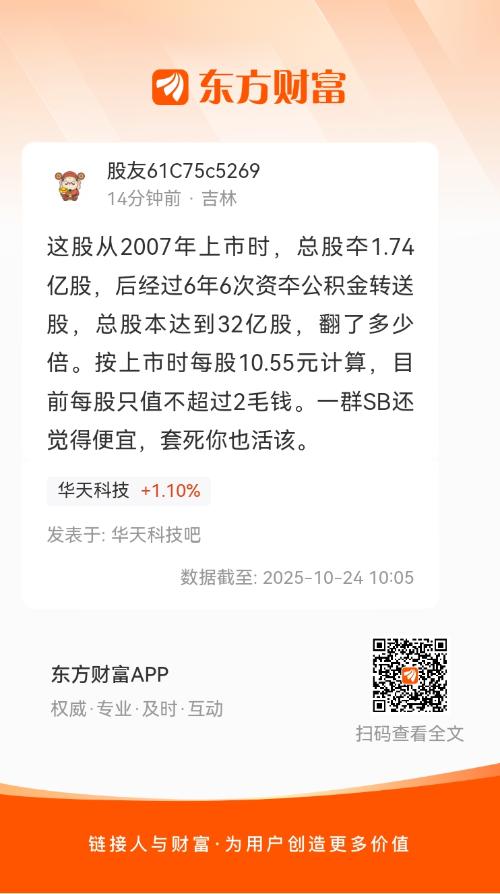 这股从2007年上市时,总股夲1.74亿股,后经过6年6次资夲公积金转送股,总股本达到32亿股,翻了多少倍。按上市时每股10.55元计算,目前每股只值不超过2毛钱。一群SB还觉得便宜,套死你也活该。