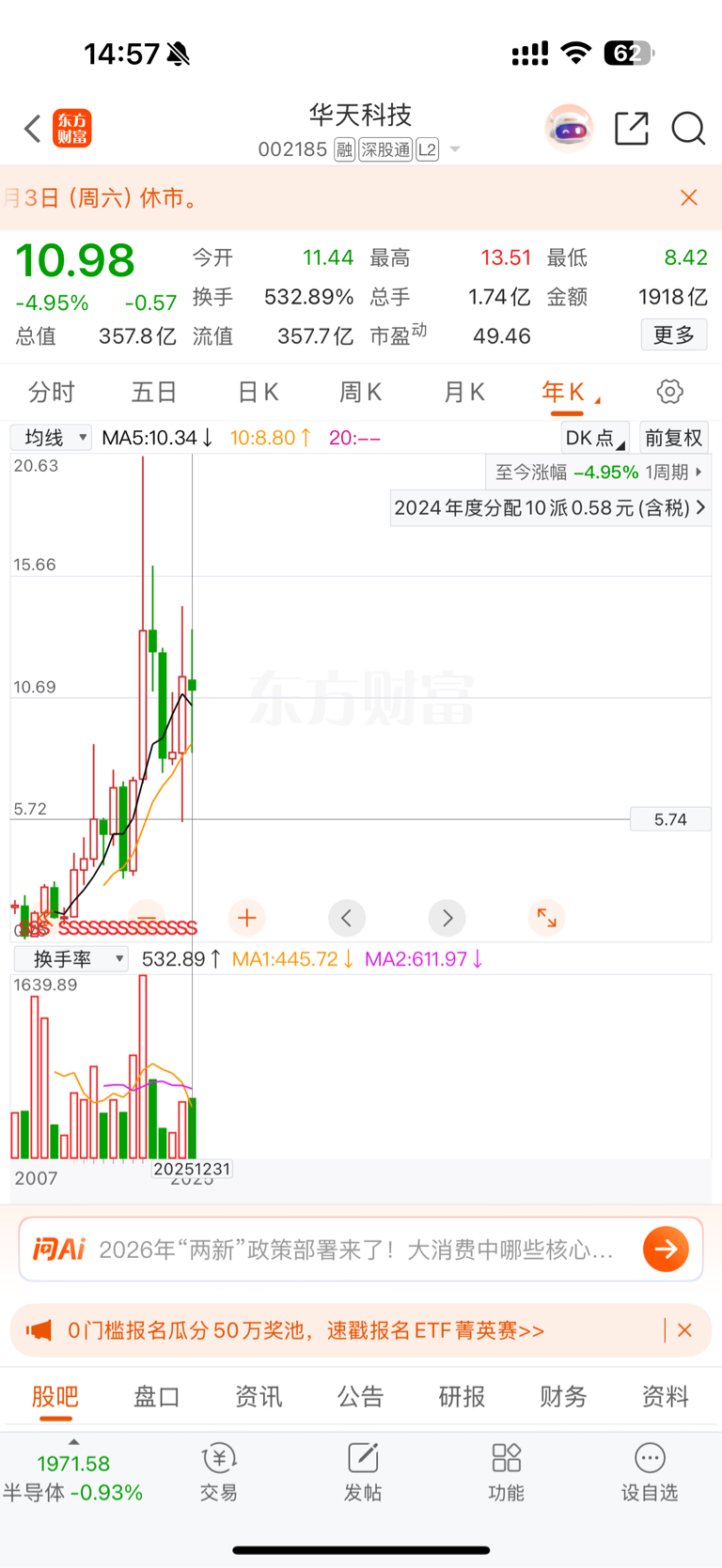 $华天科技(SZ002185)$ 真棒,一年结束了,恭喜华天一年到头各种利好加持下,怒跌5%,展望新的一年,愿华天能红过2026