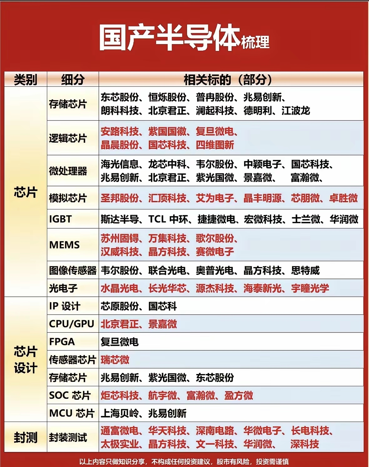 国产半导体产业链呈现“设计引领、制造追赶、设备材料突破、封测领先”格局,核心驱动为AI算力+国产替代+政策扶持三重共振。以下按产业链环节梳理龙头,附核心逻辑与投资要点。
