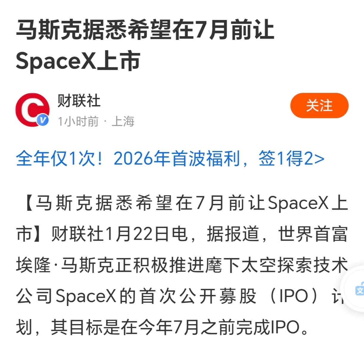 $华天科技(SZ002185)$ 【马斯克据悉希望在7月前让SpaceX上市】财联社1月22日电,据报道,世界首富埃隆·马斯克正积极推进麾下太空探索技术公司SpaceX的首次公开募股(IPO)计划,其目标是在今年7月之前完成IPO。