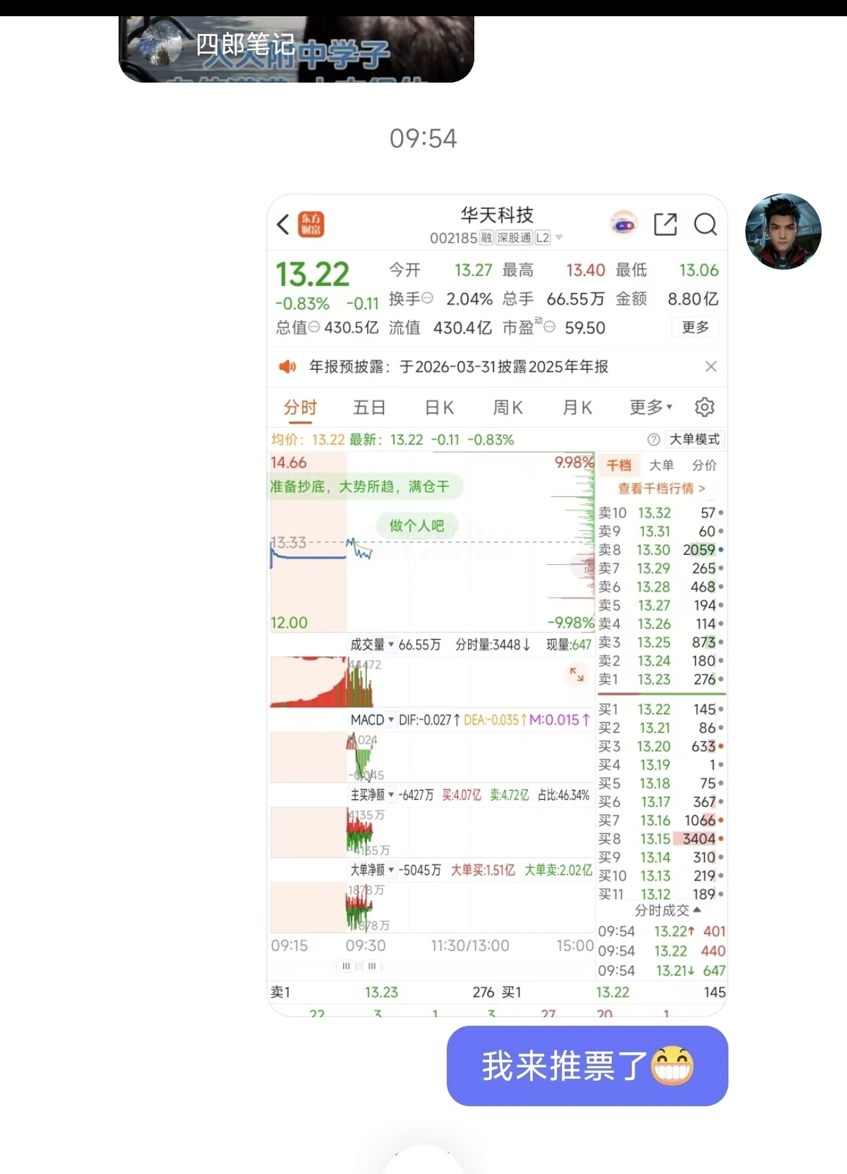 $华天科技(SZ002185)$ 今天给妹妹推的票竟然涨停了