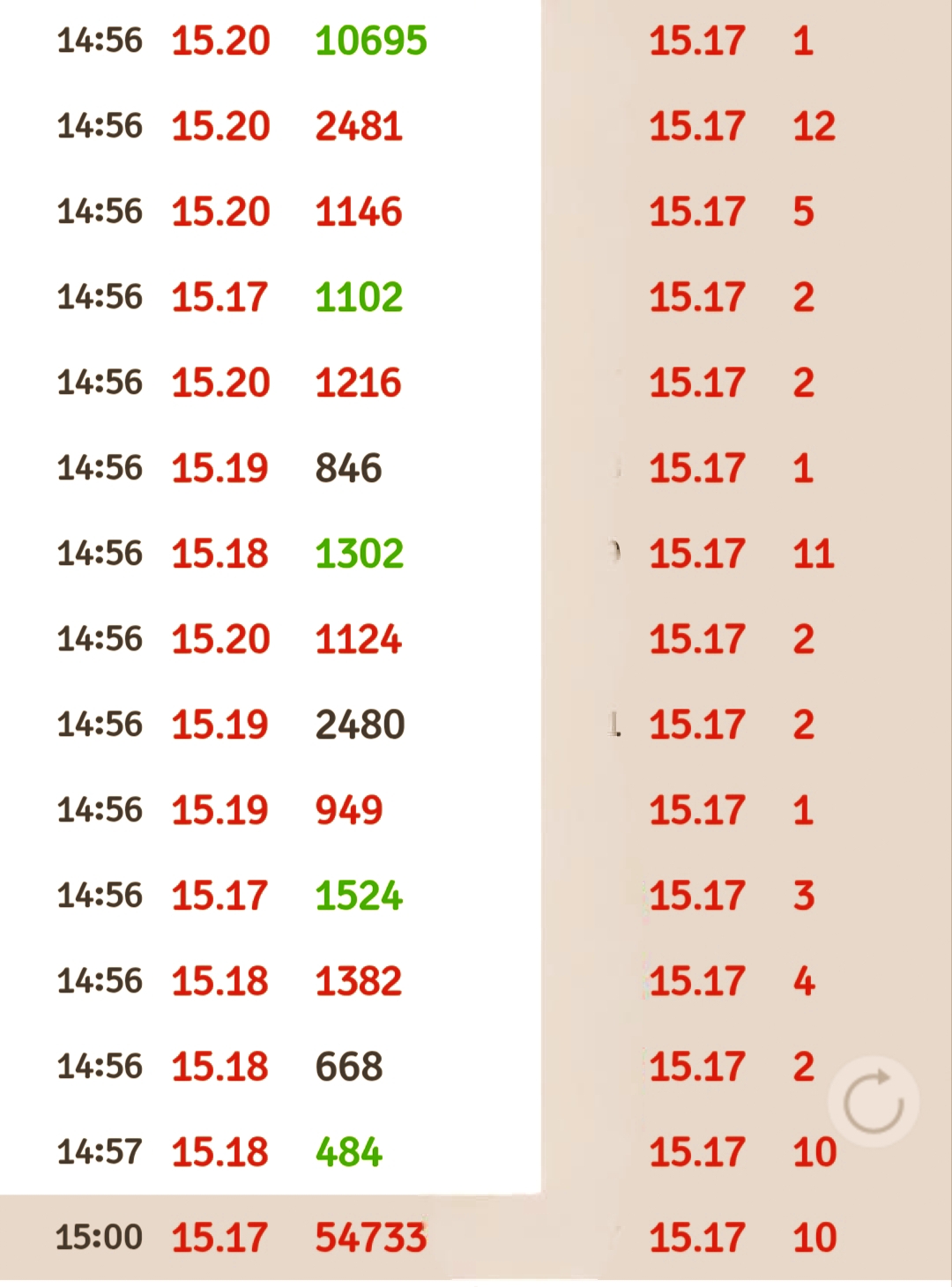 最后收盘这个劲都憋不到应是做不到15.2以上↑↑↑有人最后一刻15.7大笔进项真