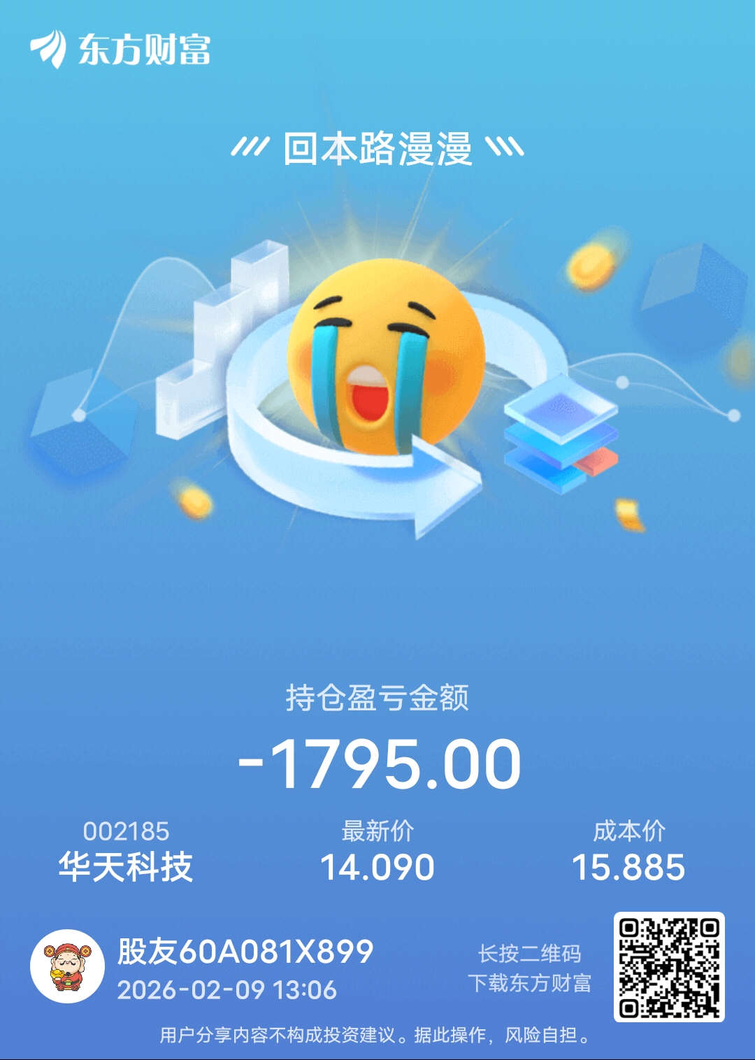 温馨提示: 1.根据《证券法》规定,禁止编造、传播虚假信息或者误导性信息,扰乱证券市场;2.用户在本社区发表的所有资料、言论等仅代表个人观点,与本网站立场无关,不对您构成任何投资建议。用户应基于自己的独立判断,自行决定证券投资并承担相应风险。《东方财富社区管理规定》