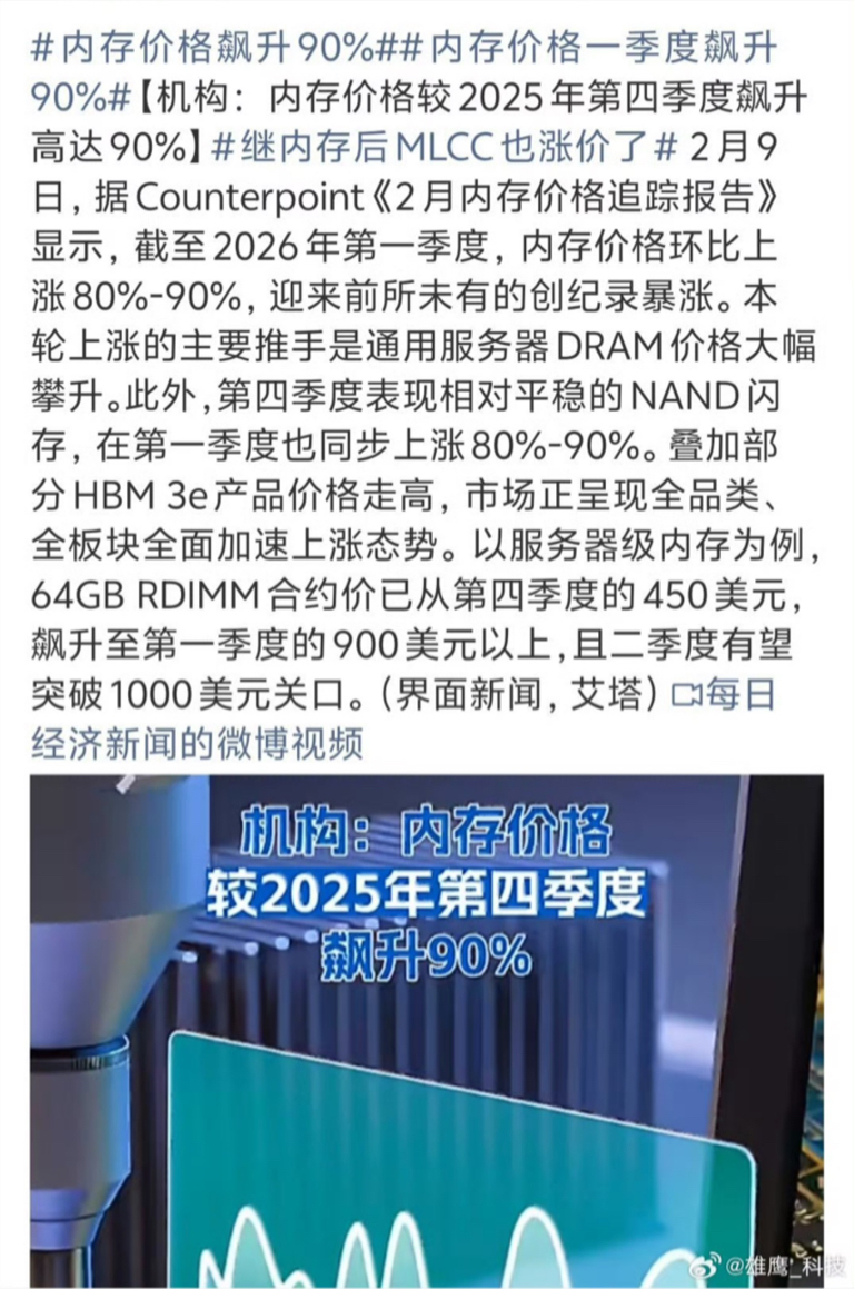内存价格暴涨90%
