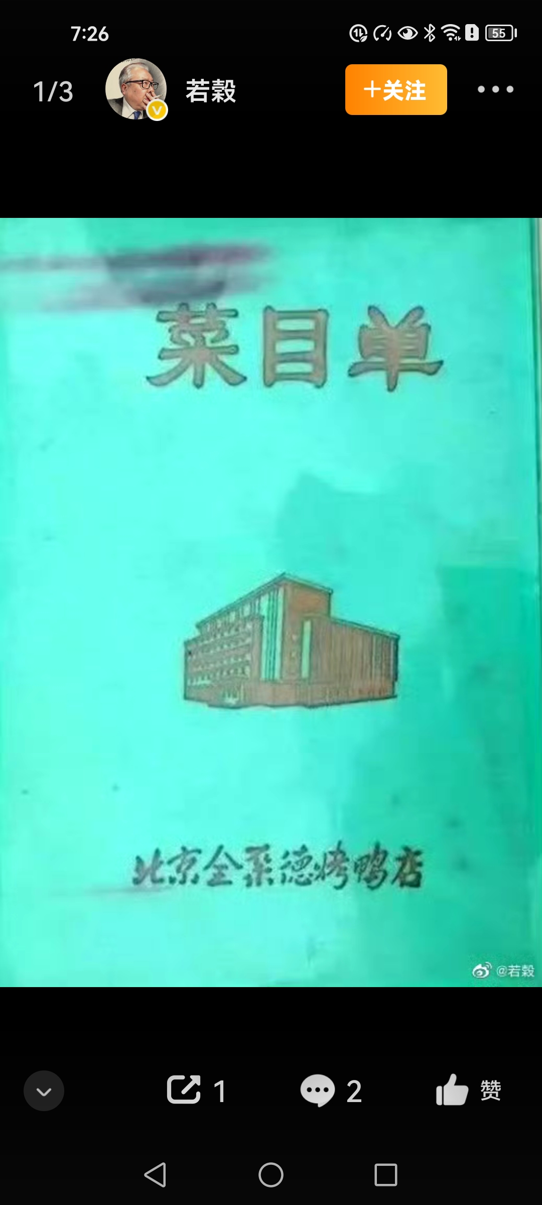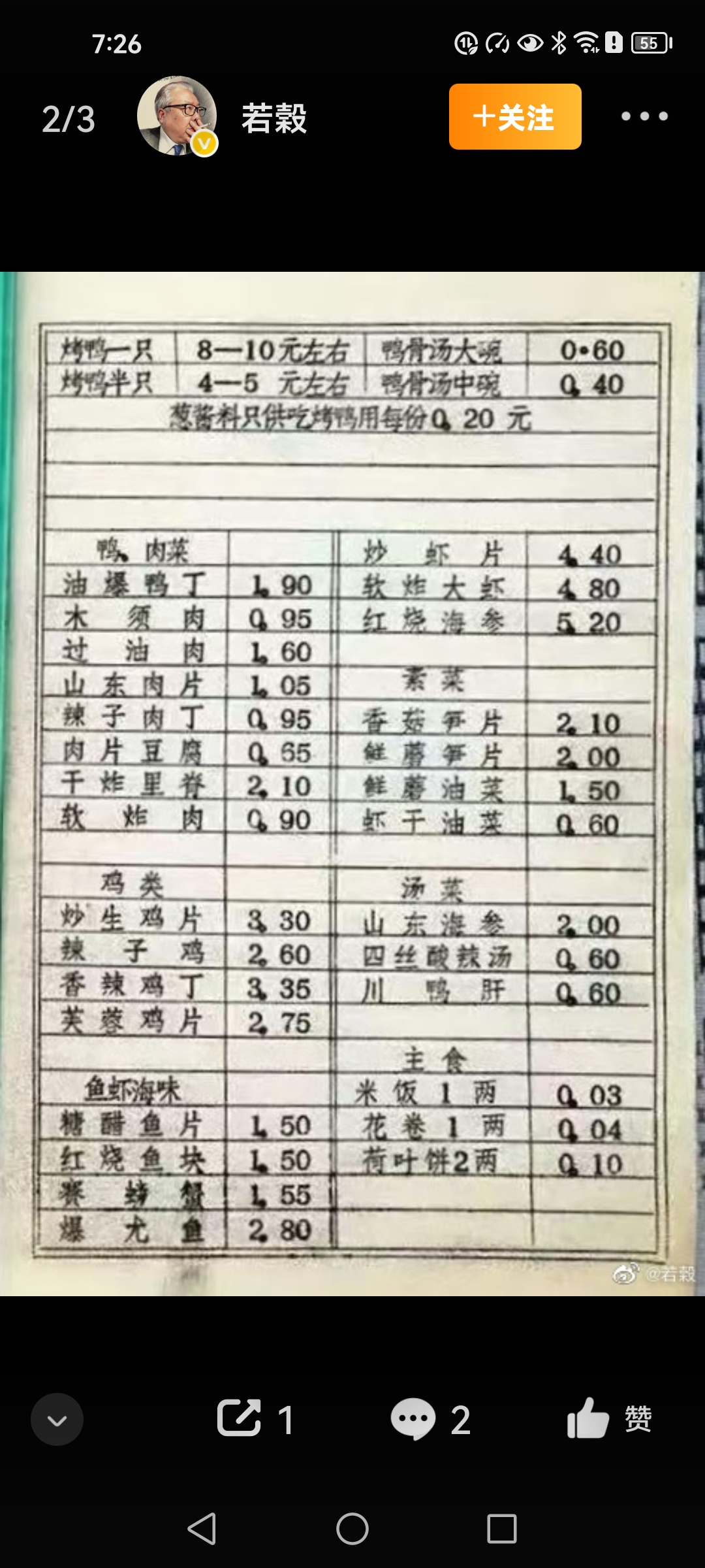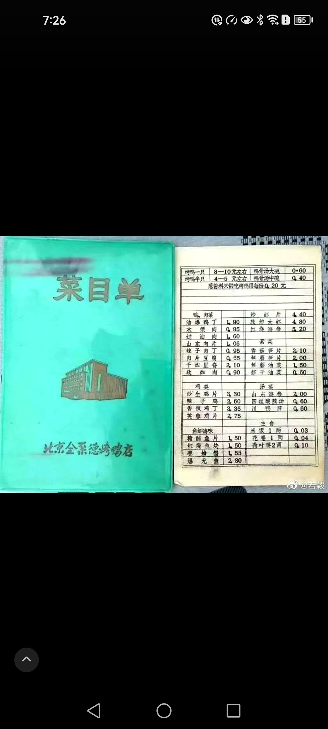 【照片故事】这是1986年北京全聚德烤鸭店的《菜目单》。一只烤鸭8—10元,其余