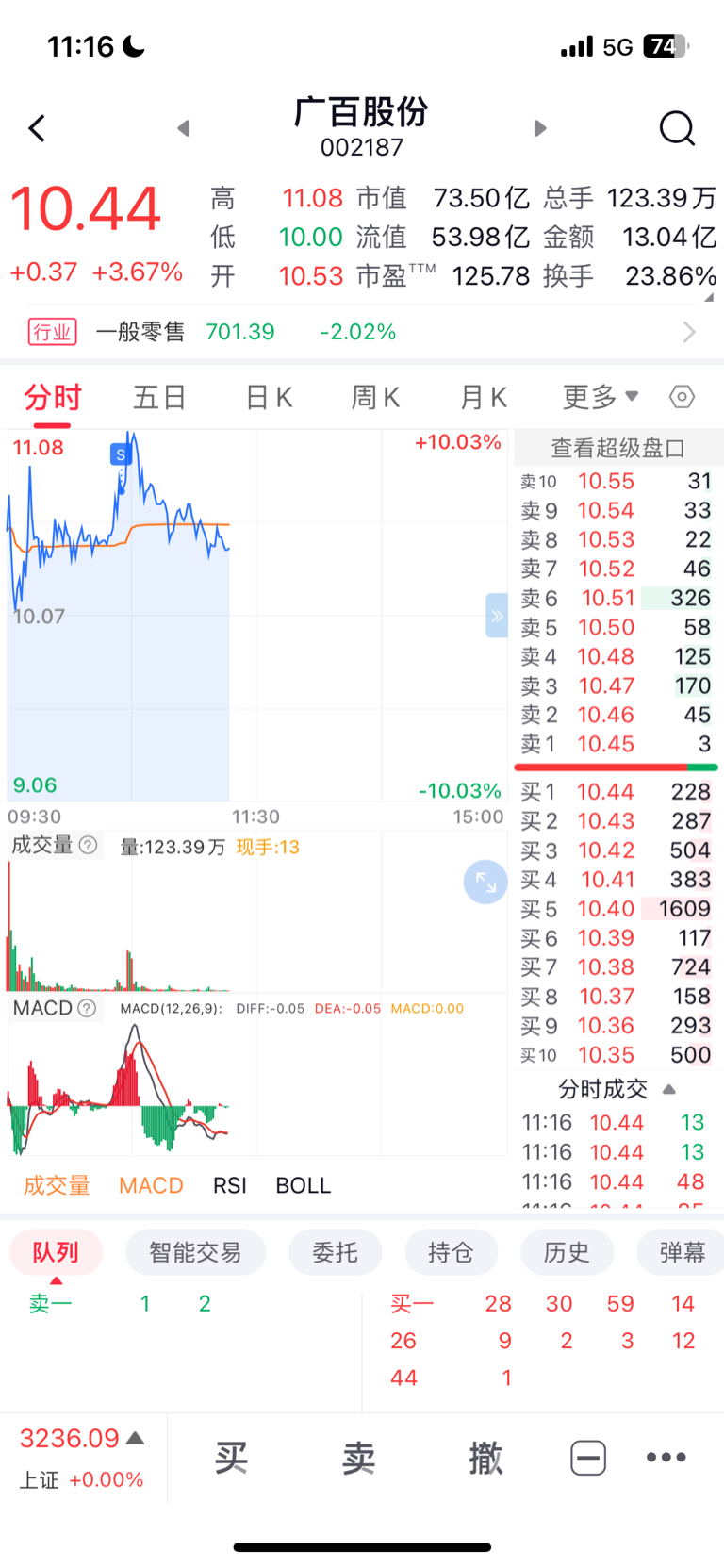 $广百股份(SZ002187)$ 10·80走了,板块不行啊,不然今天是要板的,可惜,生不逢时啊