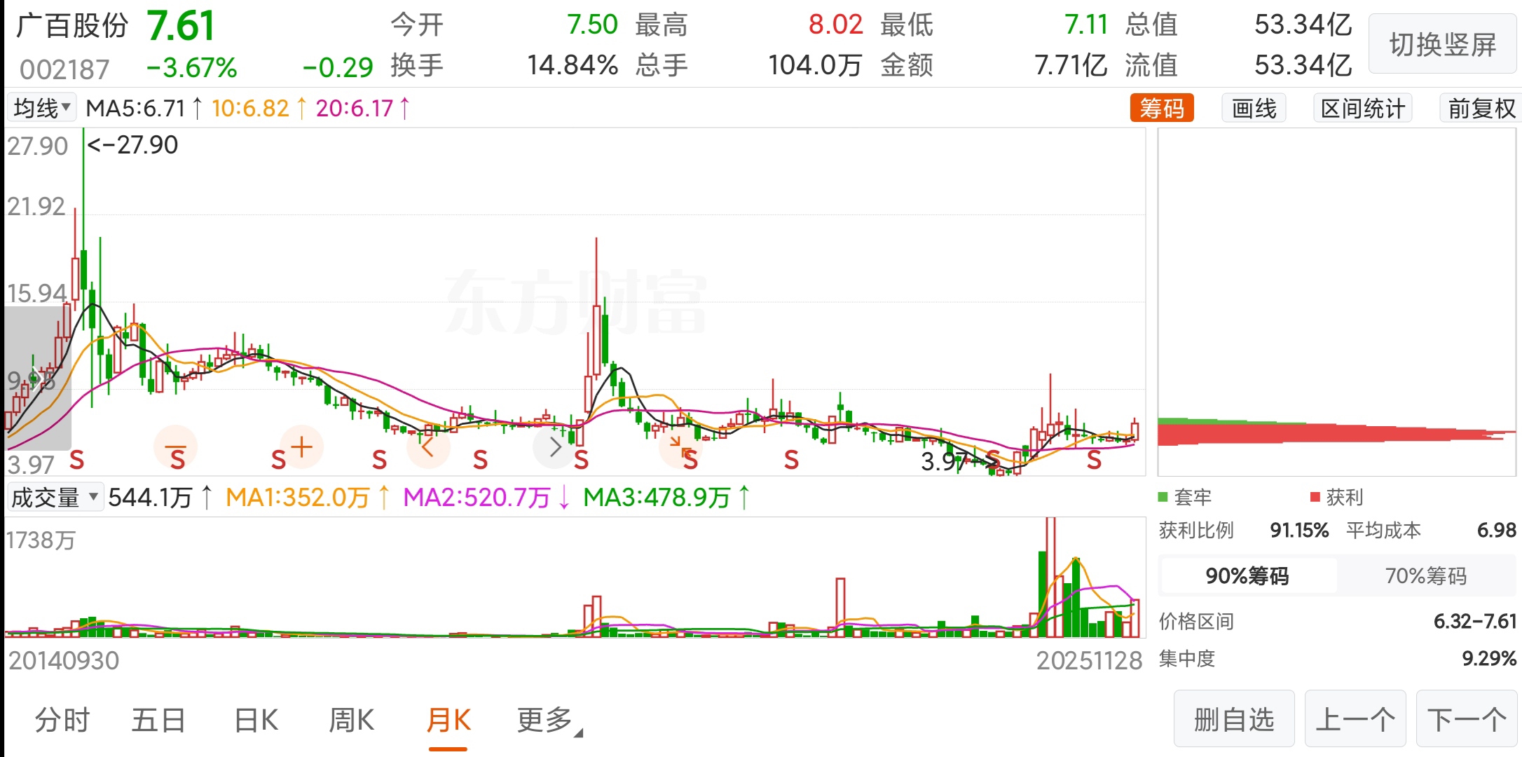 买入持有广百股份都是有福分的,目前广百股份日线,周线,月线筹码峰高度集中,又赶上