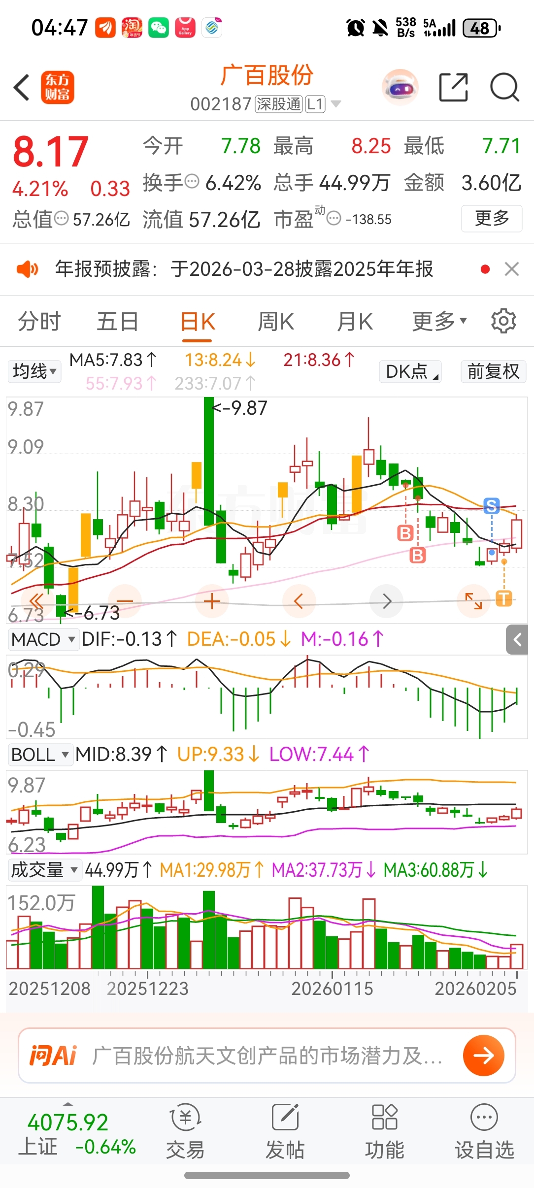 $广百股份(SZ002187)$ 1月23日8.65元买的,到昨天亏15个点左右,昨天做T,不小心点到全仓买入,今天回本还挣了几个点。#炒股日记#