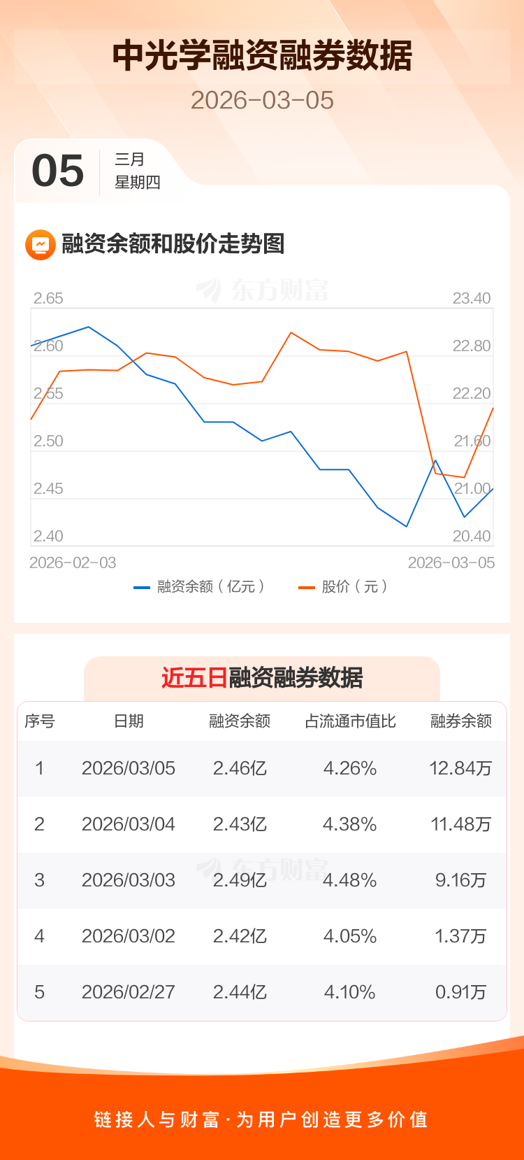 交易所最新数据显示,中光学于2026年3月5日获融资买入1311.26万元,融资偿还1020.70万元,当日融资净买入290.56万元。目前,该股融资余额2.46亿,占流通市值比例为4.26%。