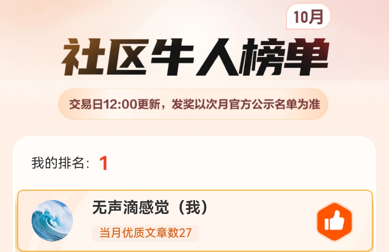 1.第一次坐上10月社区牛人榜第一名的宝座,暂时的。