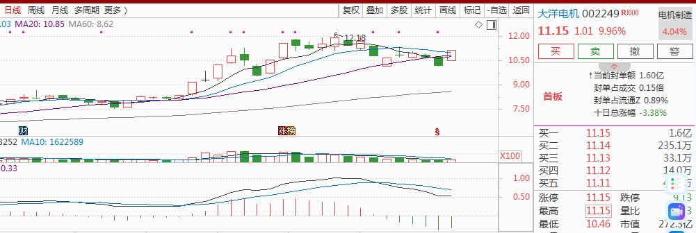 今天再度看好,周五之所以倒在黎明前,不是对大洋电机的看空,而是对大盘莫名的大跌始料不及才采取的避险措施,当再出现良机的时候不会跟做错过意不去。大洋电机的逻辑首先是机器人+新能源汽车属性,公司是国内为数不多的能够同时覆盖传统燃油车及新能源汽车动力方案的独立第三方供应商,2025年2月设立“人形机器人电机”项目组,目前已完成机器人关节模组方案设计。第二个是风能属性,子公司中山宜必思开发了针对海上风电具有高防护的风机产品,刚好切中昨天题材分析里的利好。第三个是欲递交境外上市股份(H股)发行上市申请,这个利好还没发酵,是后期的加分项。第四个是回购方案,公司拟将回购股份价格上限由6.77/股调整为15/股,同时对回购实施期限延长6个月,即回购实施期限为自2024年11月11日至2026年5月10日。 昨天的涨停止住了下跌的势头,金叉重新出现,有希望借助四大利好走出二波行情。