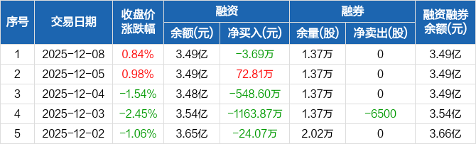 成飞集成:融资净偿还3.69万元,融资余额3.49亿元(12-08)
