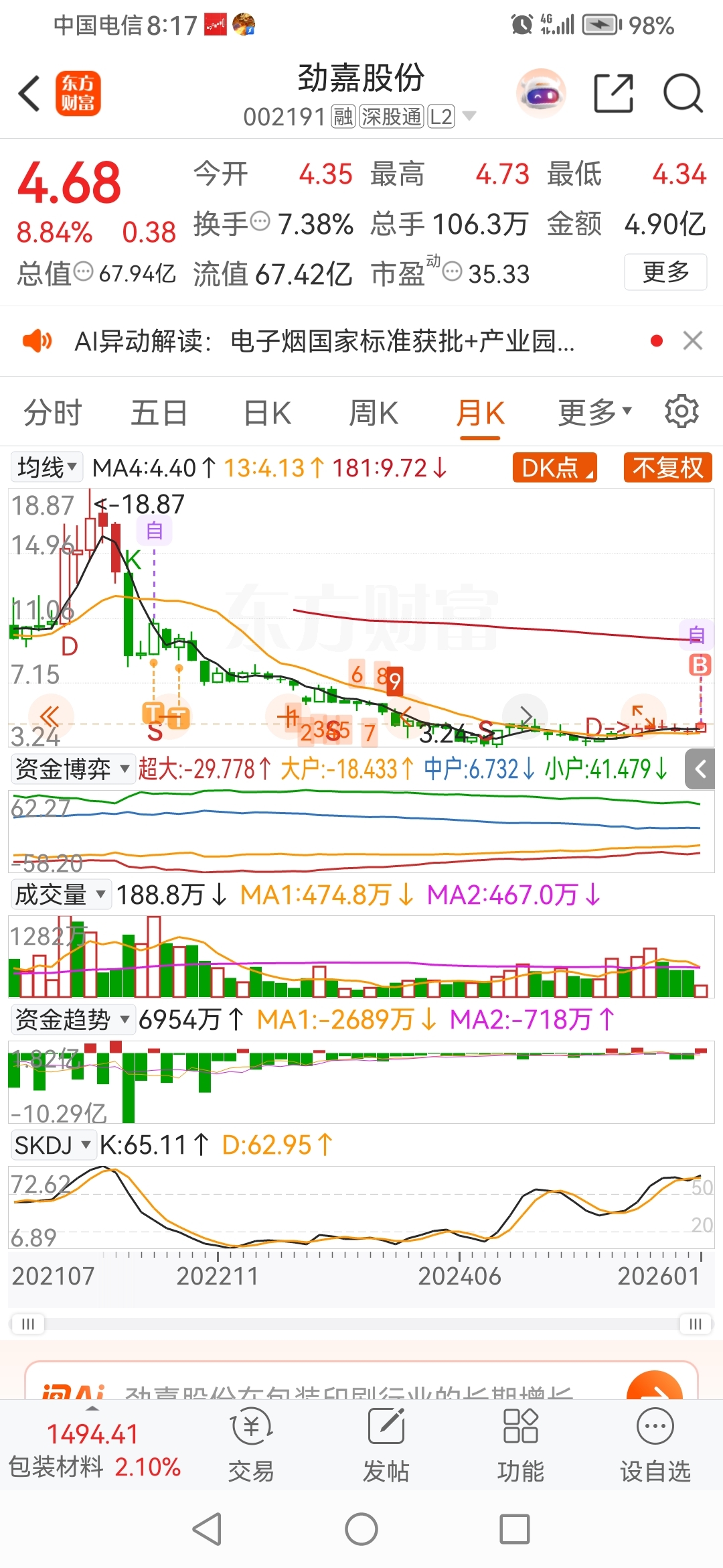 $劲嘉股份(SZ002191)$ 这个主力应该是长线,我在10元的时候做T都没有套人。#炒股日记#
