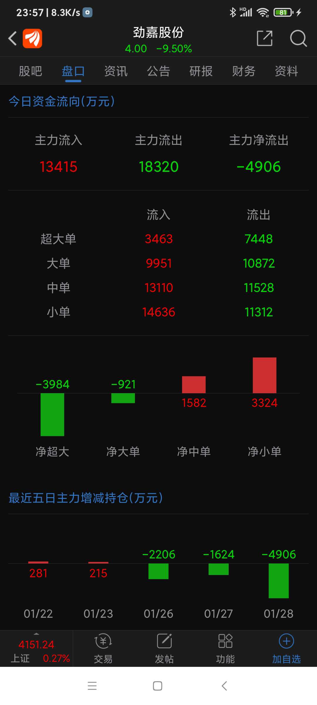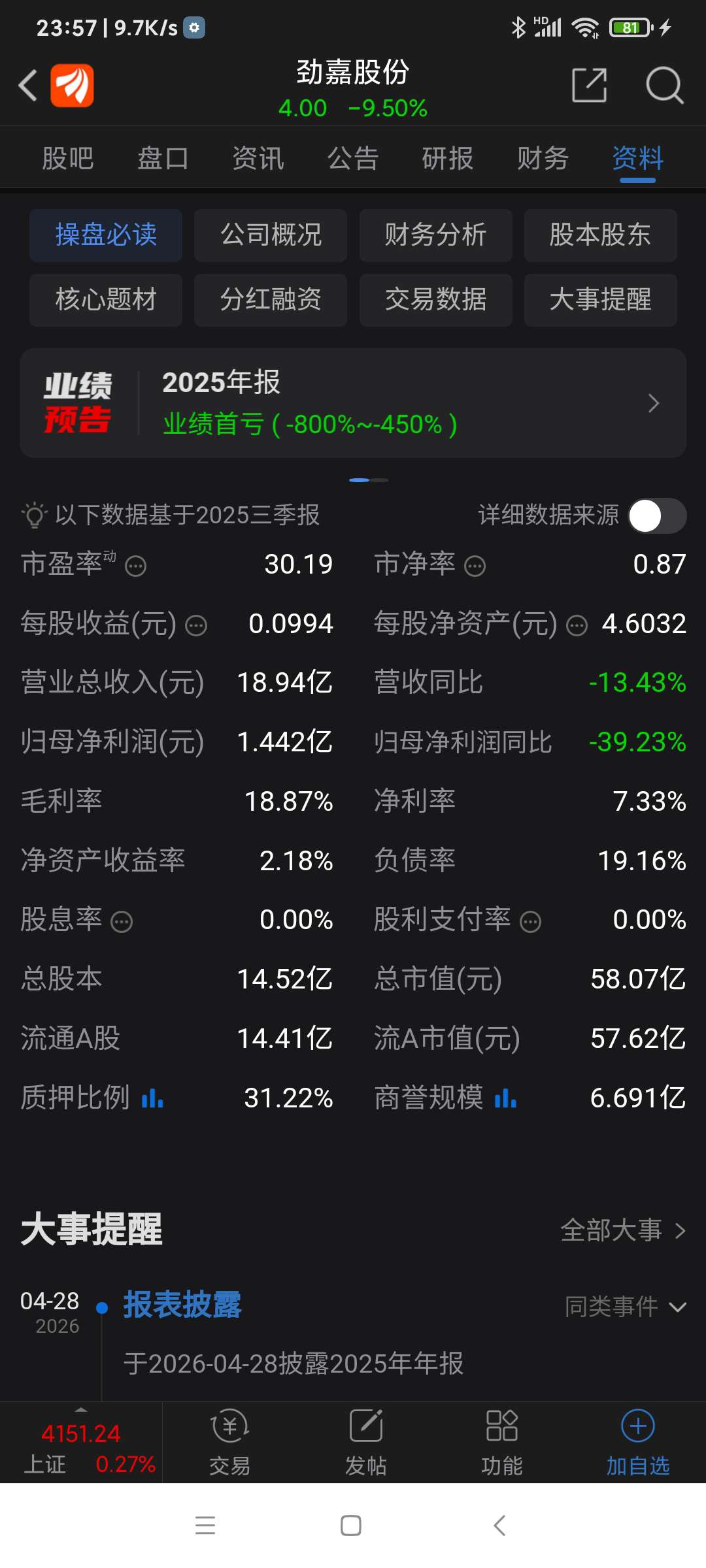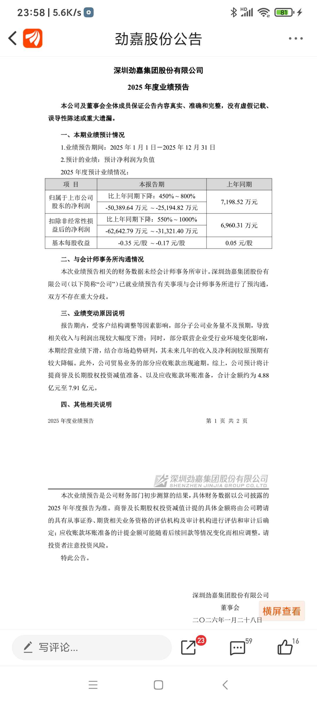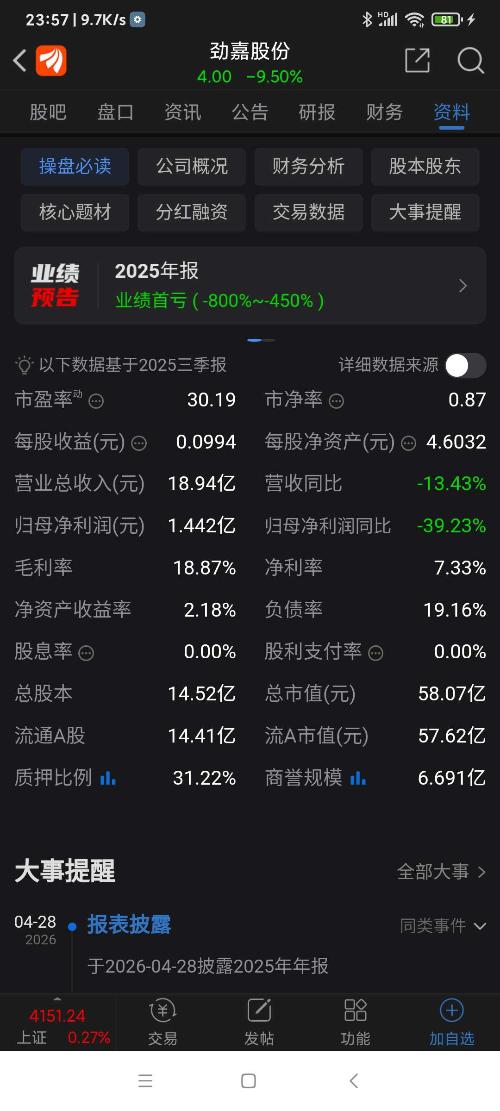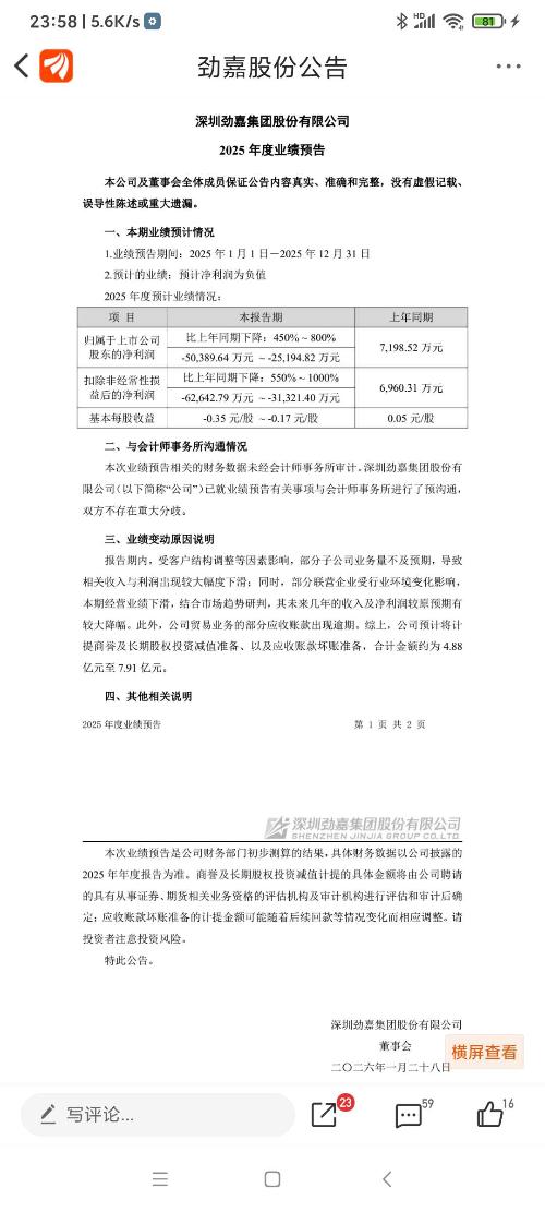 劲嘉股份,三季报还盈利1.44亿元,元月27日晚上,年报预告却预亏5.03亿元,