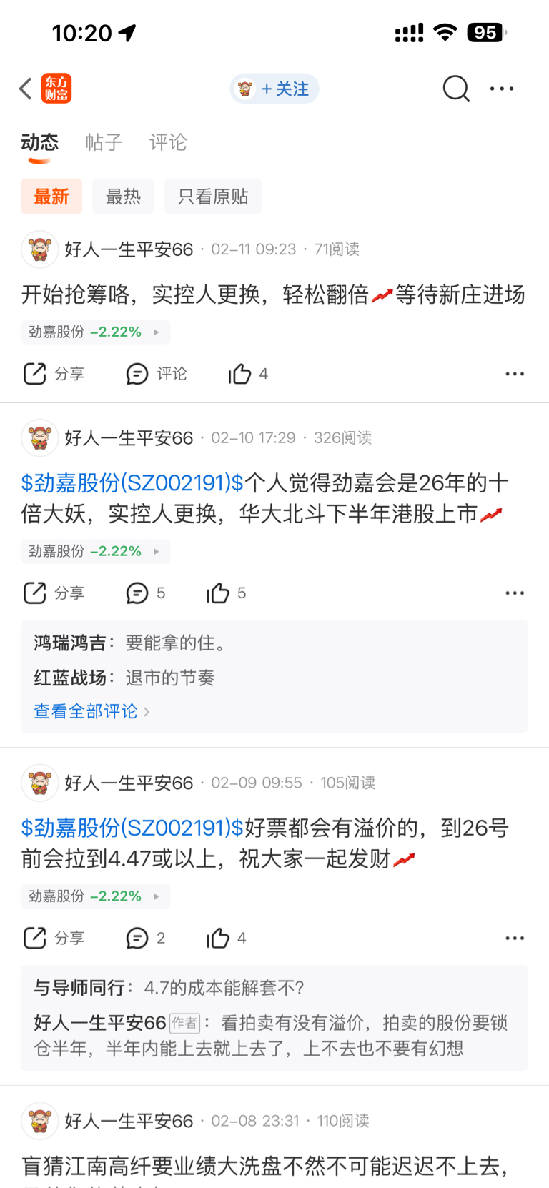 $劲嘉股份(SZ002191)$ 这个唱多的毕仔子,都已经把这些帖子删了