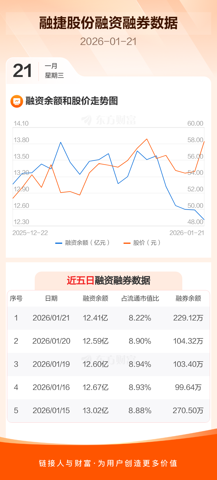 交易所最新数据显示,融捷股份于2026年1月21日获融资买入1.46亿元,融资偿还1.64亿元,当日融资净偿还1764.67万元。目前,该股融资余额12.41亿,占流通市值比例为8.22%。