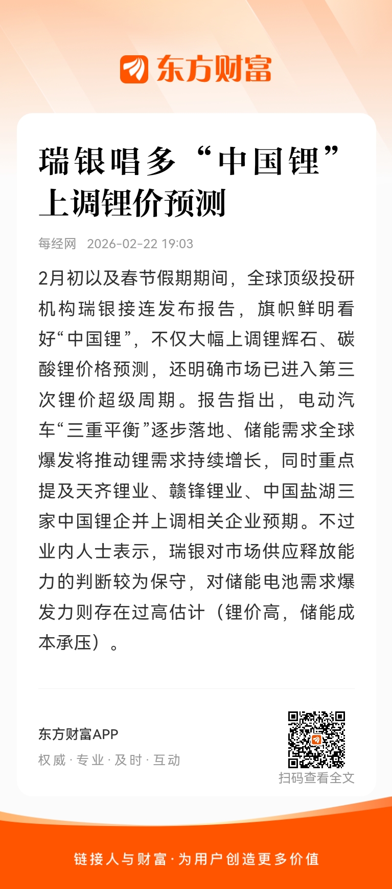 2月初以及春节假期期间,全球顶级投研机构瑞银接连发布报告,旗帜鲜明看好“中国锂”,不仅大幅上调锂辉石、碳酸锂价格预测,还明确市场已进入第三次锂价超级周期。报告指出,电动汽车“三重平衡”逐步落地、储能需求全球爆发将推动锂需求持续增长,同时重点提及天齐锂业、赣锋锂业、中国盐湖三家中国锂企并上调相关企业预期。不过业内人士表示,瑞银对市场供应释放能力的判断较为保守,对储能电池需求爆发力则存在过高估计(锂价高,储能成本承压)。