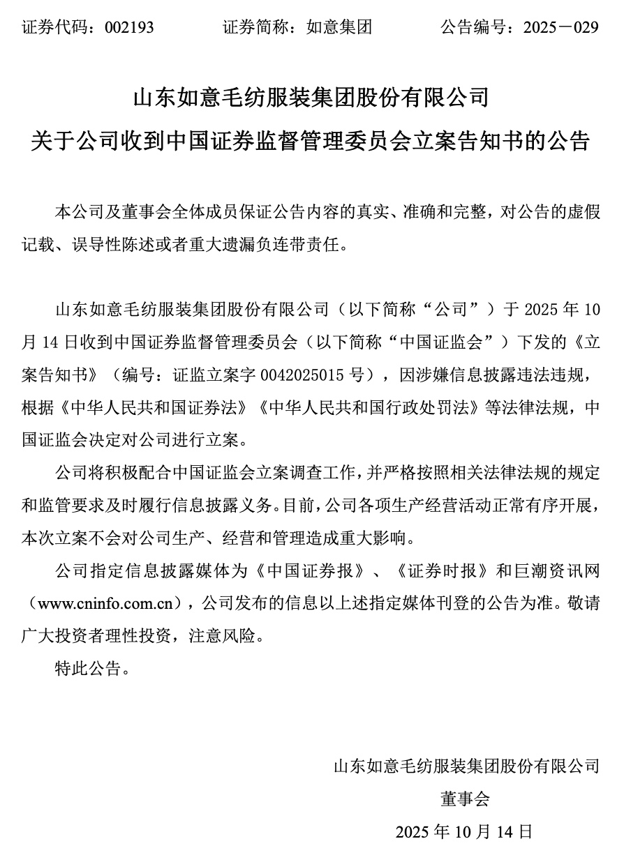 10月14日晚间,如意集团(002193.SZ)公告称,公司于2025年10月14日收到中国证监会下发的《立案告知书》,因涉嫌信息披露违法违规,根据相关法律法规,中国证监会决定对公司进行立案。