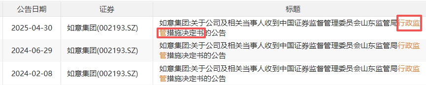 最近的一次是今年4月30日,彼时如意集团发布公告称,收到山东证监局下发的关于对公司采取责令改正、出具警示函措施的决定,以及关于对公司实控人邱亚夫等九名人员采取出具警示函措施的决定。公告显示,公司存在三方面问题: