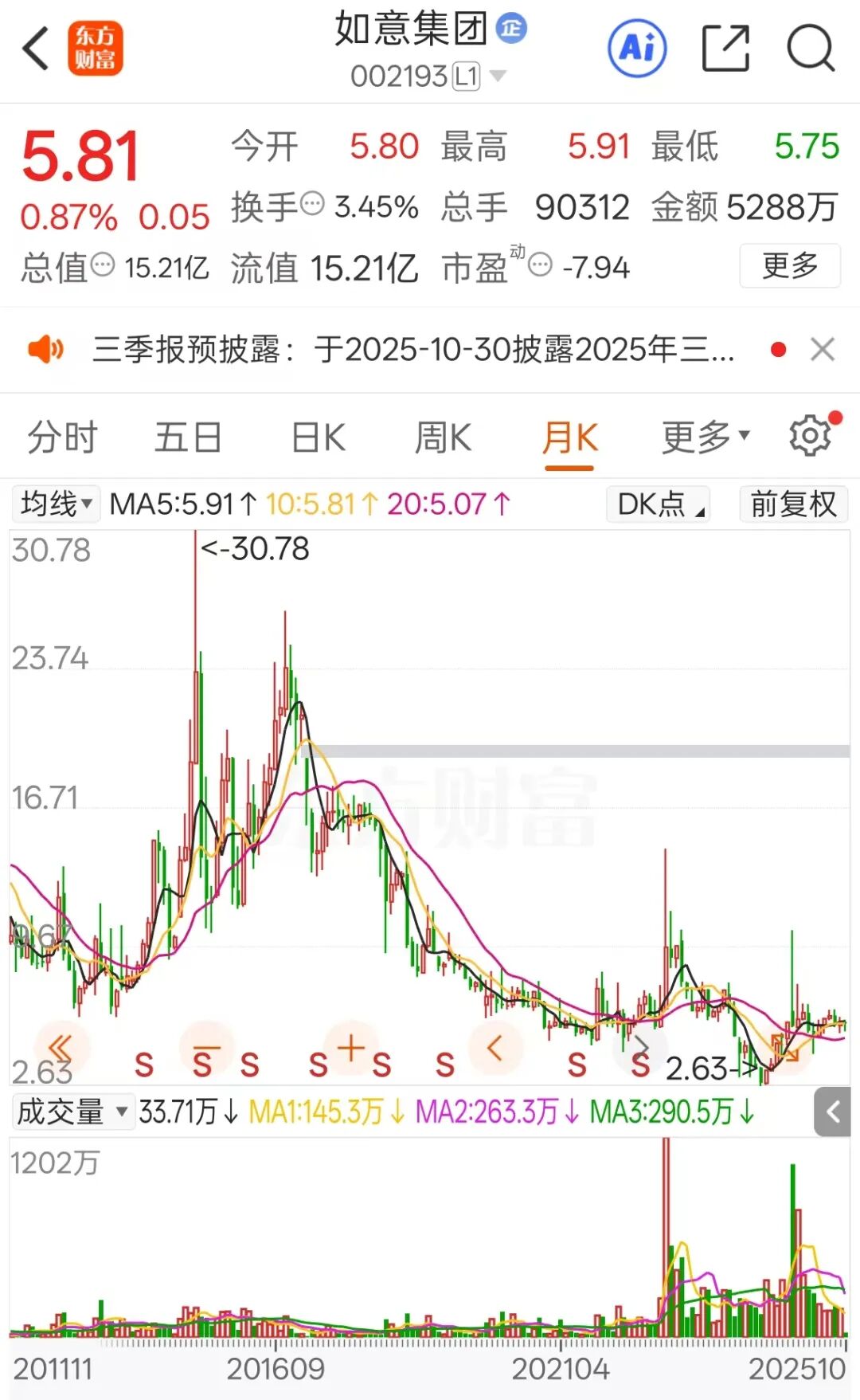 截至10月14日收盘,如意集团总市值为15.21亿元;截至今年上半年末,公司有股东约2.56万户。