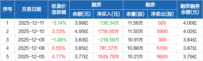 武汉凡谷:融资净偿还136.34万元,融资余额3.99亿元(12-11)