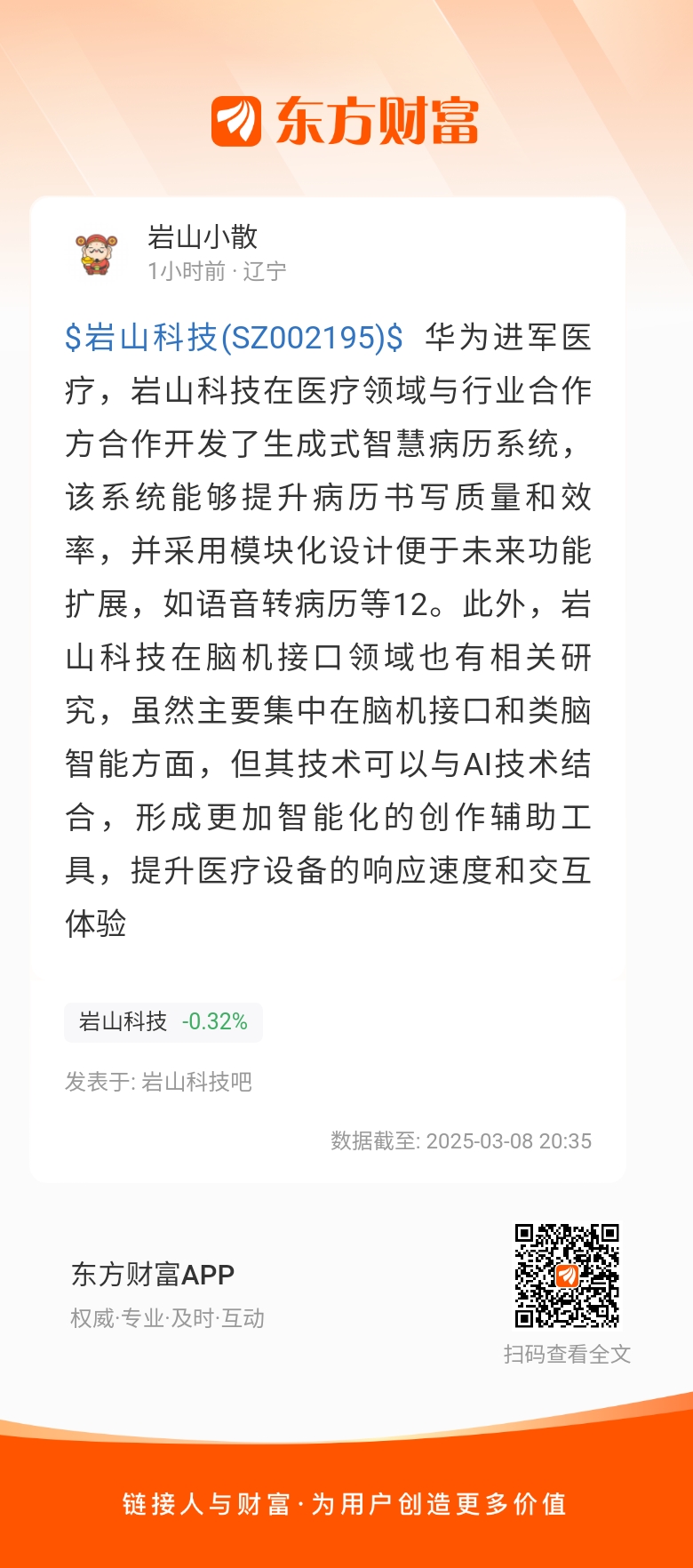 $岩山科技(SZ002195)$ 华为进军医疗,岩山科技在医疗领域与行业合作方合作开发了生成式智慧病历系统,该系统能够提升病历书写质量和效率,并采用模块化设计便于未来功能扩展,如语音转病历等12。此外,岩山科技在脑机接口领域也有相关研究,虽然主要集中在脑机接口和类脑智能方面,但其技术可以与AI技术结合,形成更加智能化的创作辅助工具,提升医疗设备的响应速度和交互体验