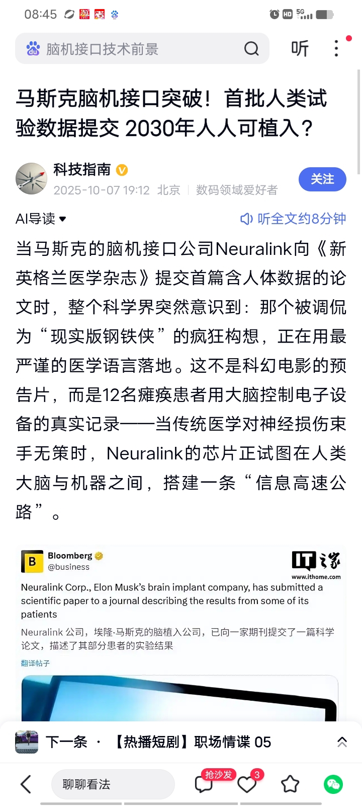 $岩山科技(SZ002195)$ 科技狂人马斯克因为特斯拉汽车被人们熟识,他涉及的汽车、航空、智能、媒体、脑机接口等产业中,真正给人类自身好处的却是后者脑机,人一旦患上了瘫痪症就等于自废武动,不仅自己受难还连累了家人,如果脑机接口技术获得突破将获益千千万万的人类。不管你信与不信,马斯克说到2030年,不仅仅是病人可以脑机“接口”实现自主活动,就连普通人也可以变得更聪明!
