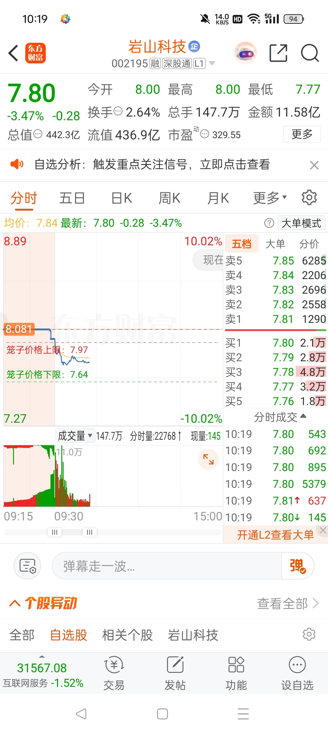 $岩山科技(SZ002195)$ 我错了各位兄弟姐妹上方抛压太重没有20亿拉不上去的,就别难为主力哥了,我亏点就亏点吧,以后再也不了