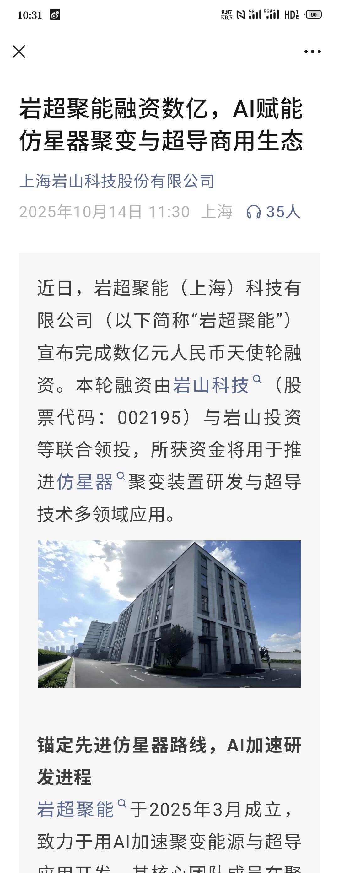 $岩山科技(SZ002195)$ 可控核聚变概念已官宣,非小道消息。就不知道岩山科技管理层什么目标。目前最热门的几大赛道(AI、可控核聚变、人脑工程、无人驾驶)岩山科技都重点投资了。就是不知道这些投资何时转化为盈利主业!岩山管理层加油!