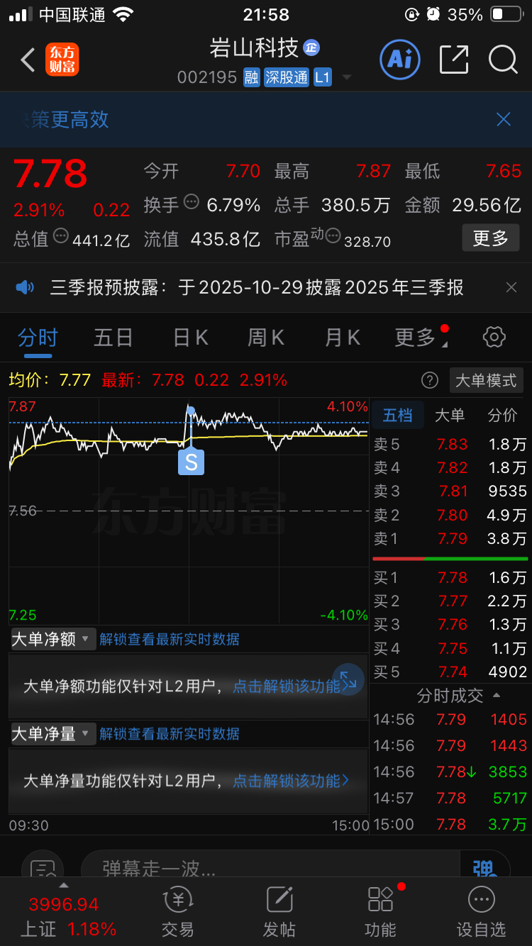 $岩山科技(SZ002195)$ 感觉岩山还得等一波,今天摸了一下30日线均线,明天回调3-4个点吧,然后震荡洗盘