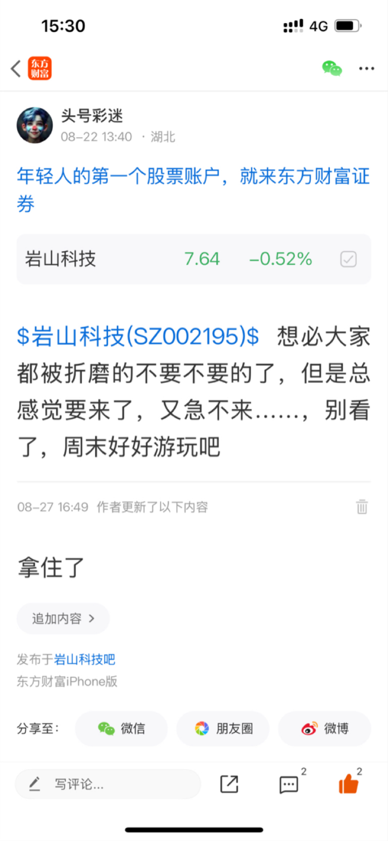 温馨提示: 1.根据《证券法》规定,禁止编造、传播虚假信息或者误导性信息,扰乱证券市场;2.用户在本社区发表的所有资料、言论等仅代表个人观点,与本网站立场无关,不对您构成任何投资建议。用户应基于自己的独立判断,自行决定证券投资并承担相应风险。《东方财富社区管理规定》