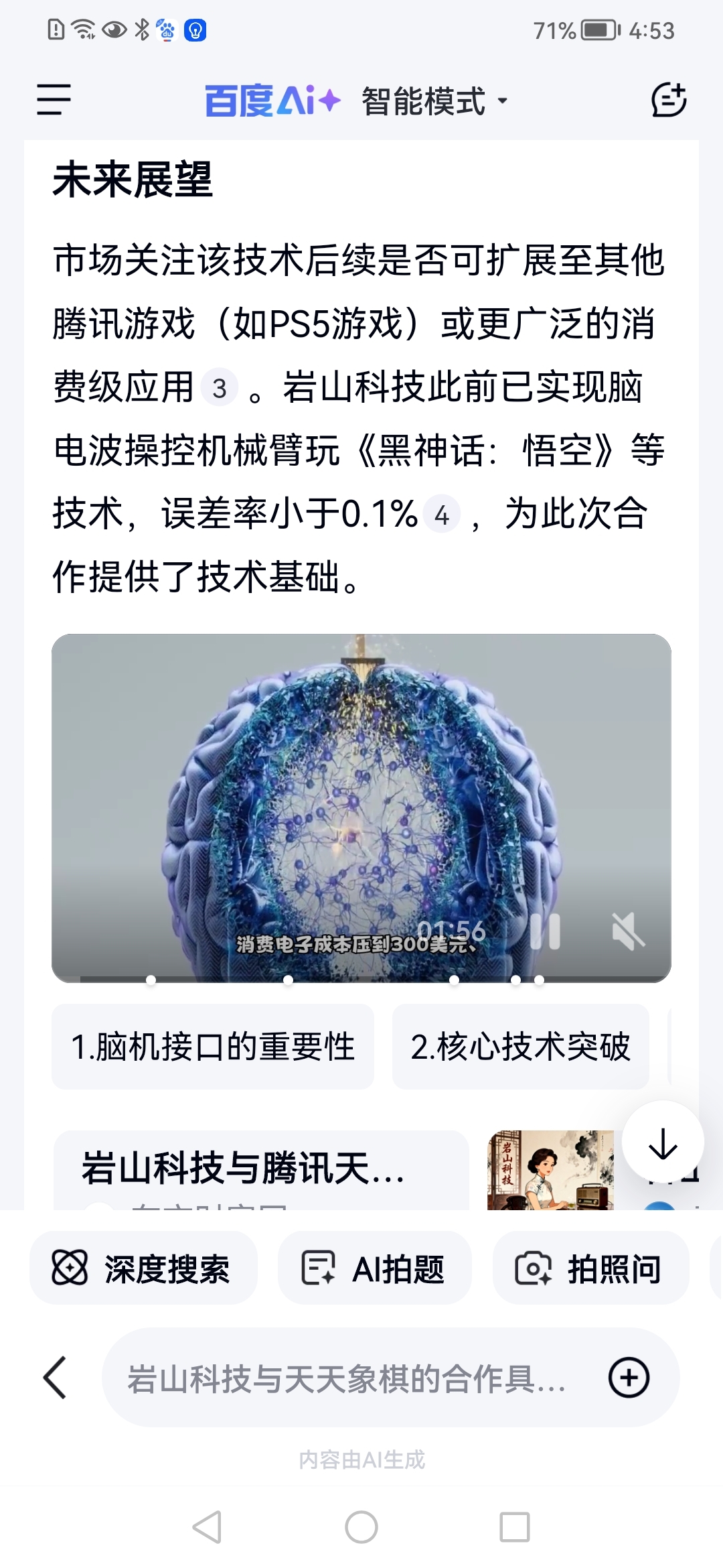 技术验证:岩山科技旗下子公司“岩思类脑”与《天天象棋》合作,首次在游戏竞技领域进行脑机接口技术的大规模公开验证。该技术通过解析脑电信号实现意念控制,初步准确率超过85%。