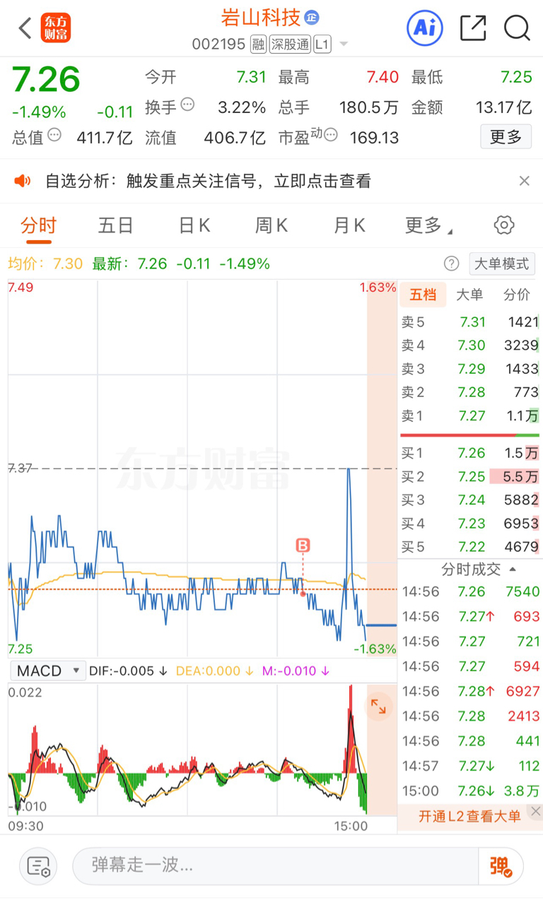 $岩山科技(SZ002195)$ 刚买入时:嘿掏上了。哈哈哈。尾盘:草草草,套上了。