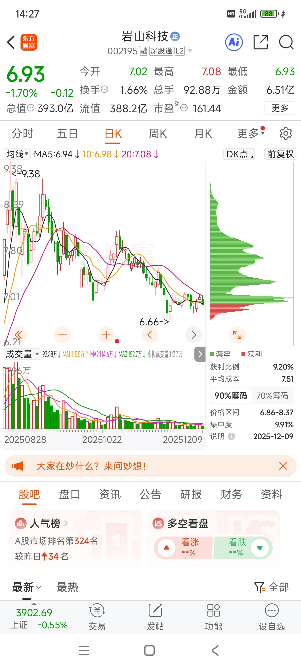 $岩山科技(SZ002195)$ 为何这股一路向下?问题出在哪里?板块涨,也涨不了;板块跌,就一直跌!