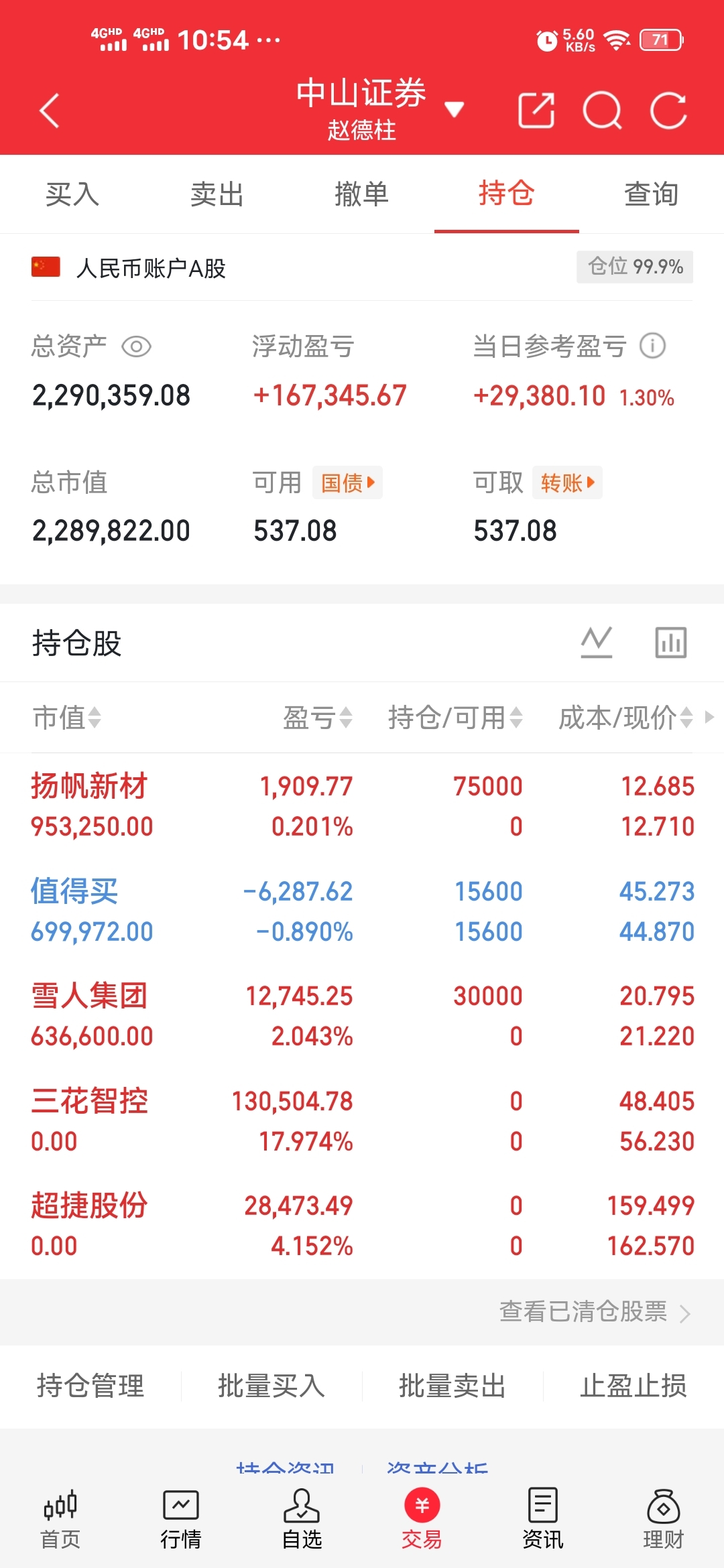 持有:值得买卖出:三花智控,超捷股份买入:雪人股份,杨帆新材已全部打满。(个人操