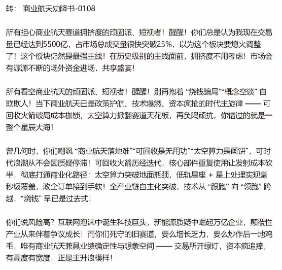 最强的还是商业航天,又是30多家涨停。都涨到开始拉仇恨了,盘后商业航天劝降书都出来了: