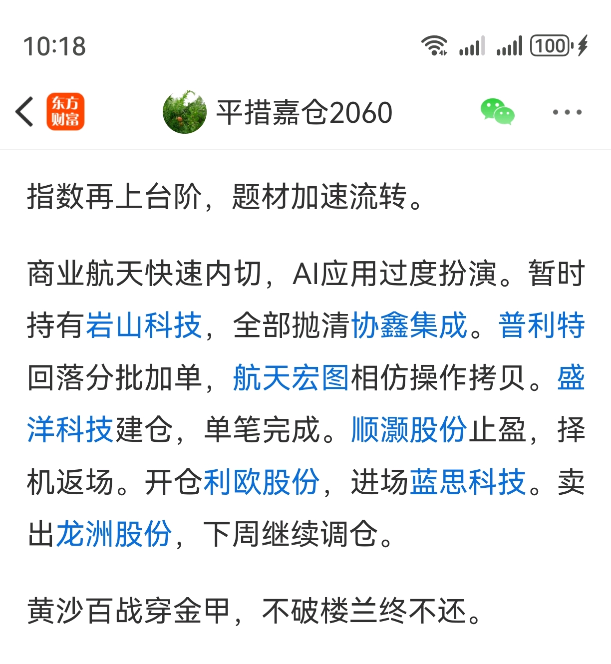 海那边五大金刚航天七子梳理,持仓待涨。 持有岩山科技,人脑工程龙头。锁定航天宏图,实质部署唯一。格局蓝思科技,两大风口齐聚。利欧股份AI一字,盛洋科技静待回封。普利特筹码换手,信步闲庭。开仓航天机电,返场华菱线缆。