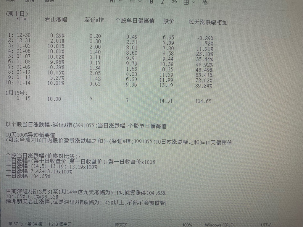 用了一些时间来了解10天100%异动偏离值规则,终于理清了,东方财富是只是计算了九天的偏离值,从12月31号至1月14号,以这九天计算:岩山科技涨跌幅-深证A指涨跌幅=东方财富所计算的偏离值89.78-6.1%=83.68但为什么东方财富会写收盘价涨幅到8.6%就会被监管,我想不明白,我的计算如下: