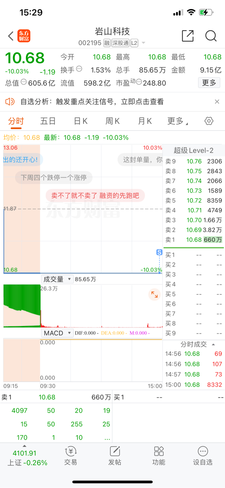 $岩山科技(SZ002195)$ 昨天下午4:17挂的 算是出来了,前面吃2板后面地板出 ,这样的高标不做也罢 只要卖晚根本出不来。