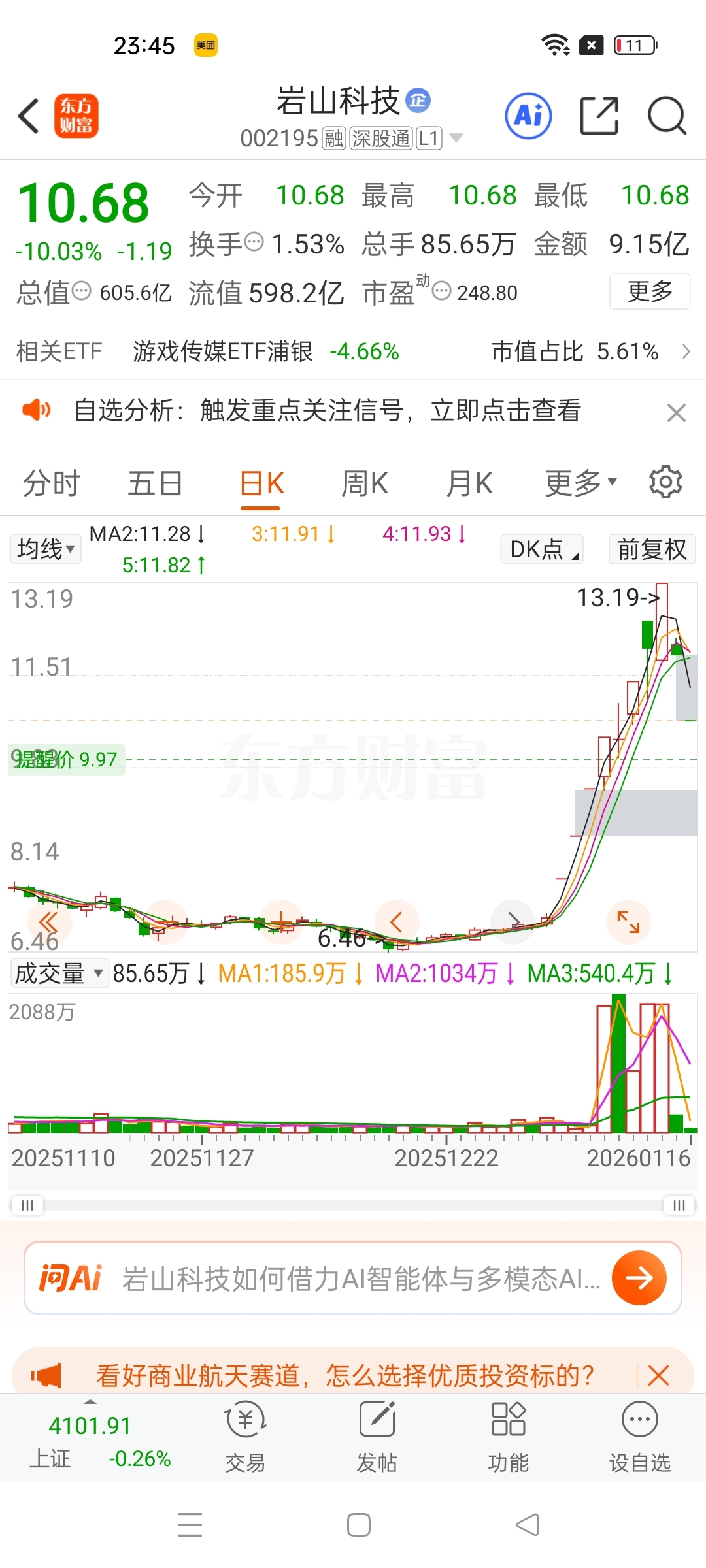 $岩山科技(SZ002195)$ 9.97位置应该会震荡,前面筹码这个隔断了无法控盘