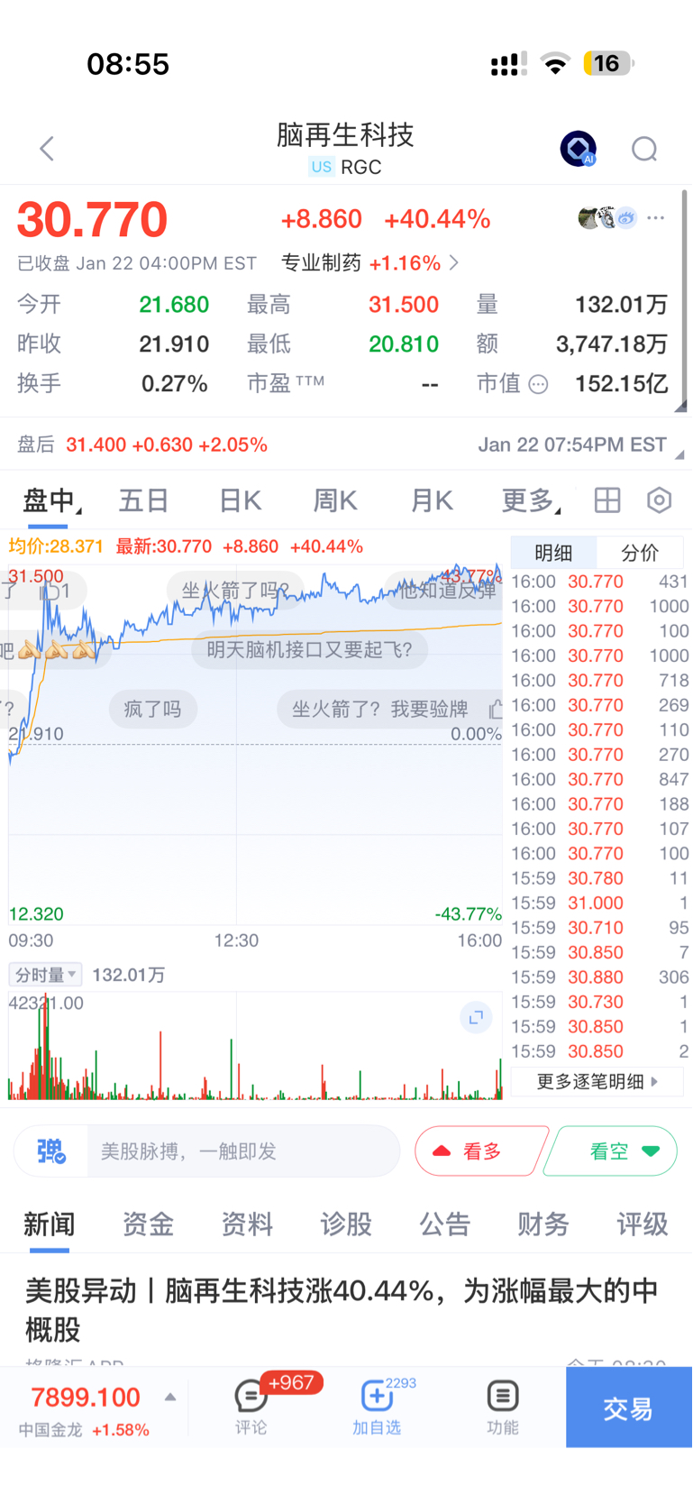 美股脑再生大涨百分之40,今天涨停了