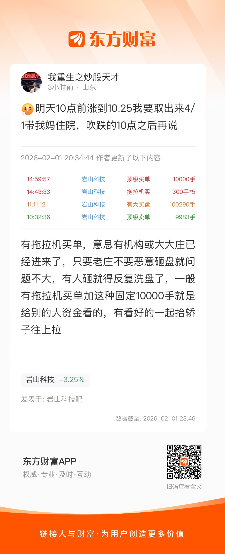 温馨提示: 1.根据《证券法》规定,禁止编造、传播虚假信息或者误导性信息,扰乱证券市场;2.用户在本社区发表的所有资料、言论等仅代表个人观点,与本网站立场无关,不对您构成任何投资建议。用户应基于自己的独立判断,自行决定证券投资并承担相应风险。《东方财富社区管理规定》