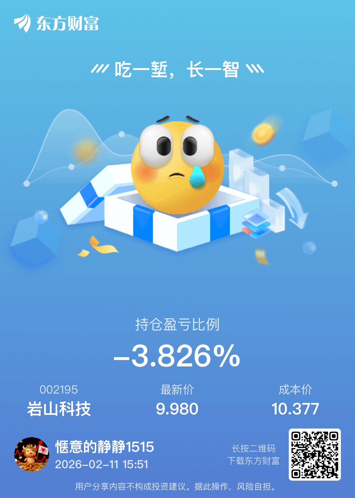 温馨提示: 1.根据《证券法》规定,禁止编造、传播虚假信息或者误导性信息,扰乱证券市场;2.用户在本社区发表的所有资料、言论等仅代表个人观点,与本网站立场无关,不对您构成任何投资建议。用户应基于自己的独立判断,自行决定证券投资并承担相应风险。《东方财富社区管理规定》