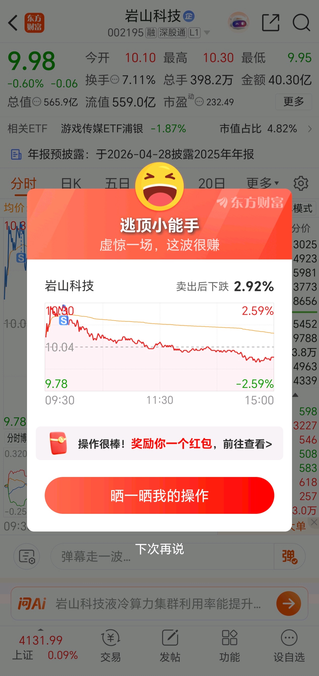 $岩山科技(SZ002195)$ 走了,感觉没希望。