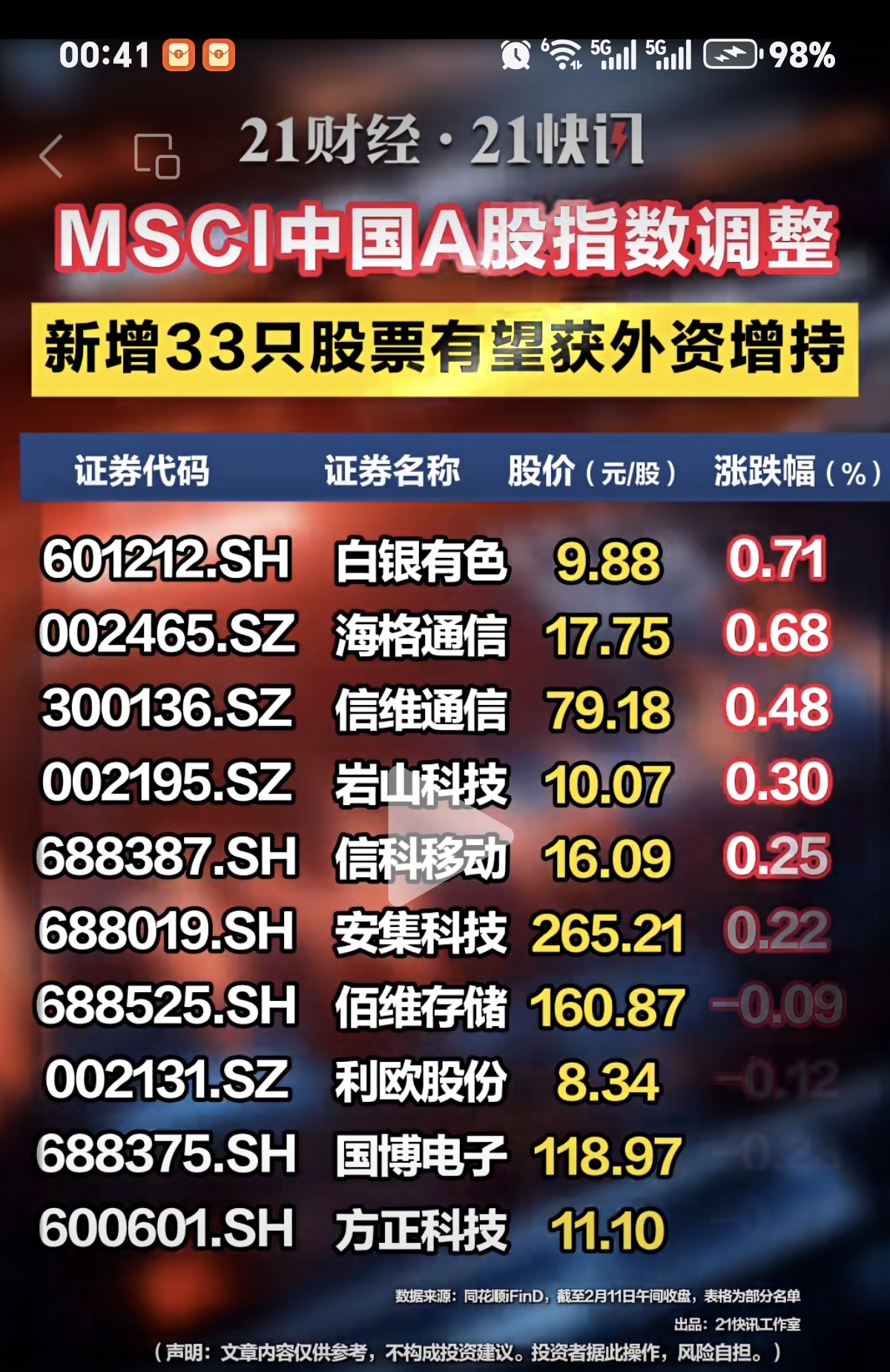 MSCI中国A股指数调整新增33只股票有望获外资增持