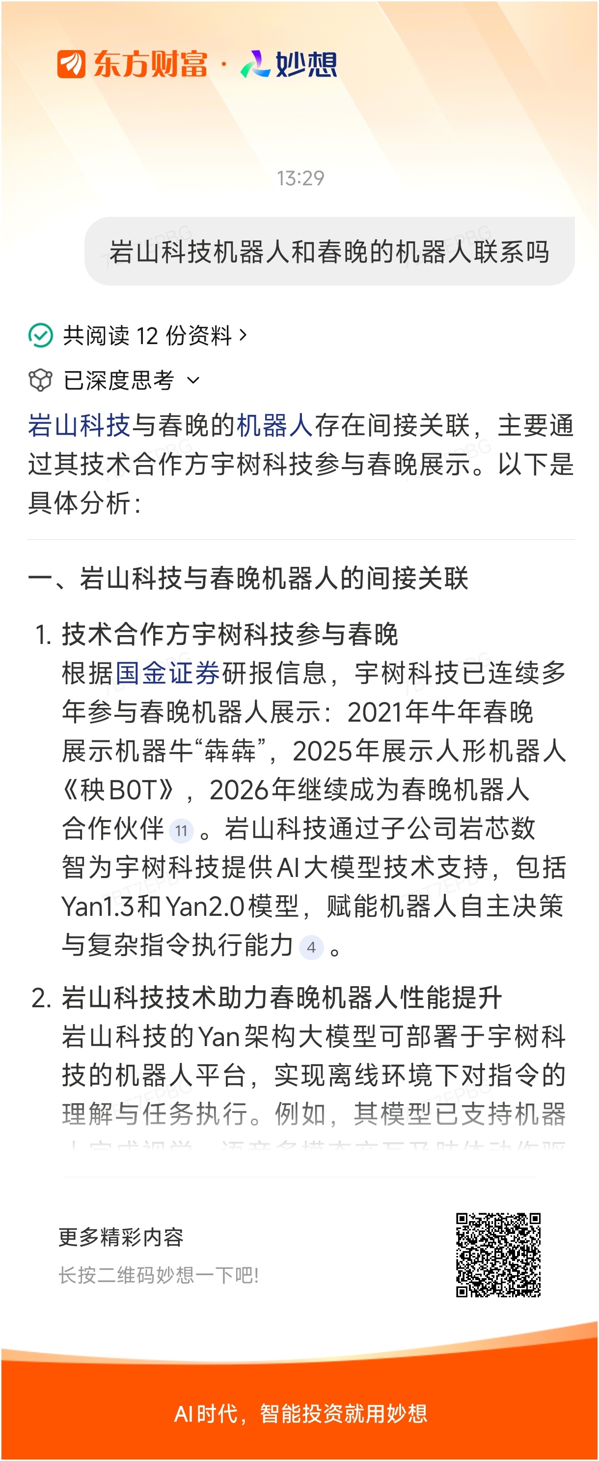 #@妙想 ,你怎么看?# 妙想一下:岩山科技机器人和春晚的机器人联系吗@妙想 $岩山科技(SZ002195)$