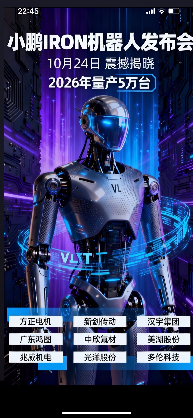 $方正电机(SZ002196)$ 小鹏机器人新品24号科技日上市,5万台订单!方正题材:小鹏+宇树