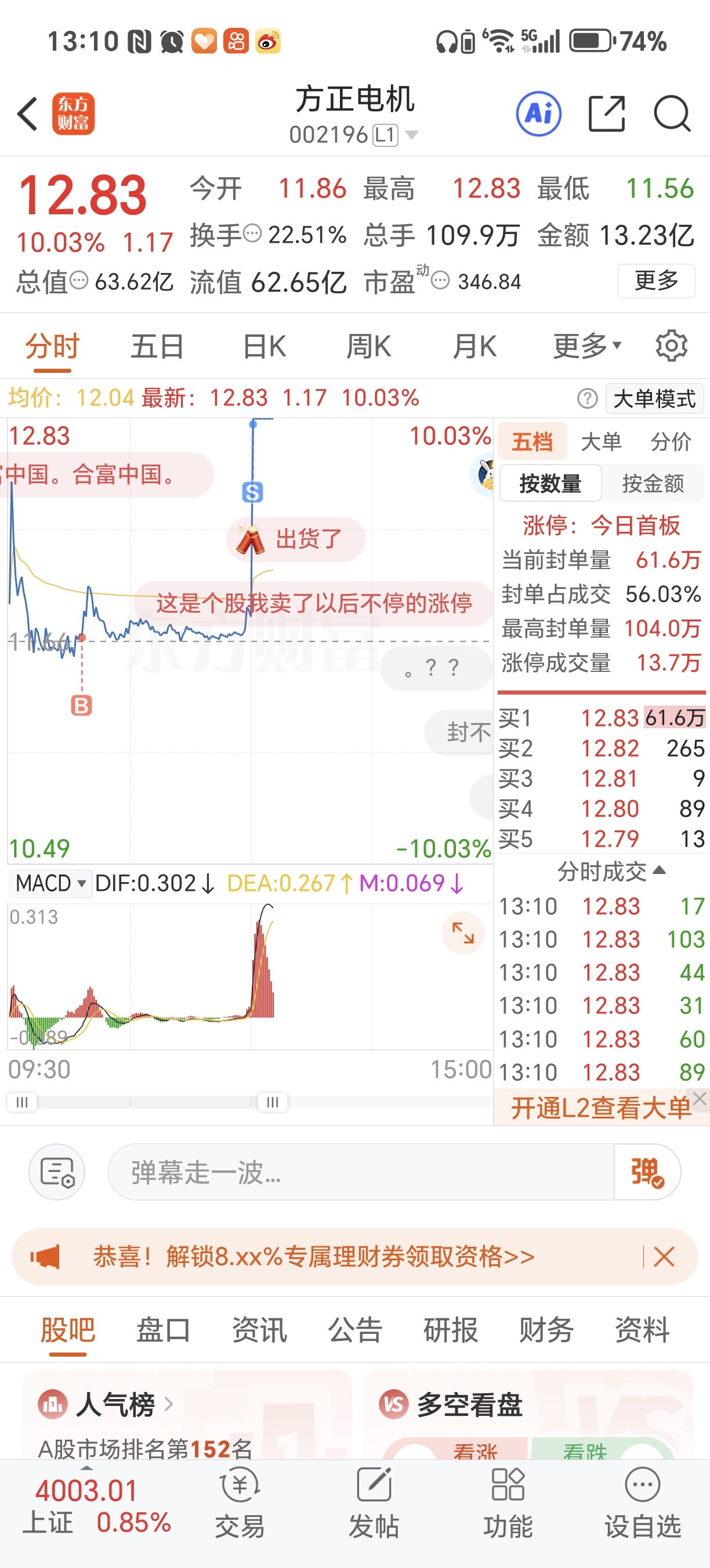 $方正电机(SZ002196)$ 今天完美做T,底仓未动,不知明天能不能够连板?